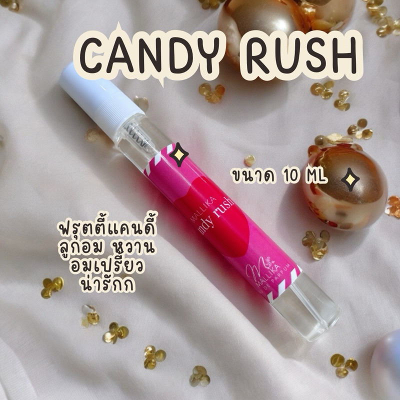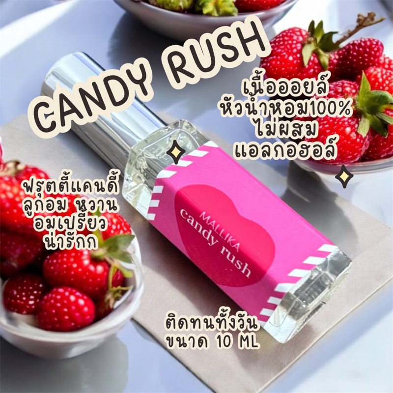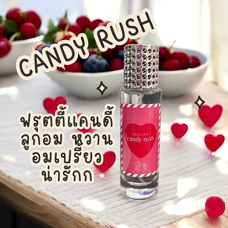 น้ำหอม Candy Rush กลิ่นหอมอันแสนจะน่ารัก ที่นำเอา Apple, Rose Centifolia และ Green Mandarin มาผสมผสานกับวานิลลา และวิปครีมได้อย่างลงตัว เป็นน้ำหอมสำหรับคนที่รักและชื่นชอบน้ำหอมกลิ่นหอมหวาน น้ำหอมแห่งความสนุกสนานและอ่อนเยาว์เป็นน้ำหอมที่มีกลิ่นหอมหวานแสนอร