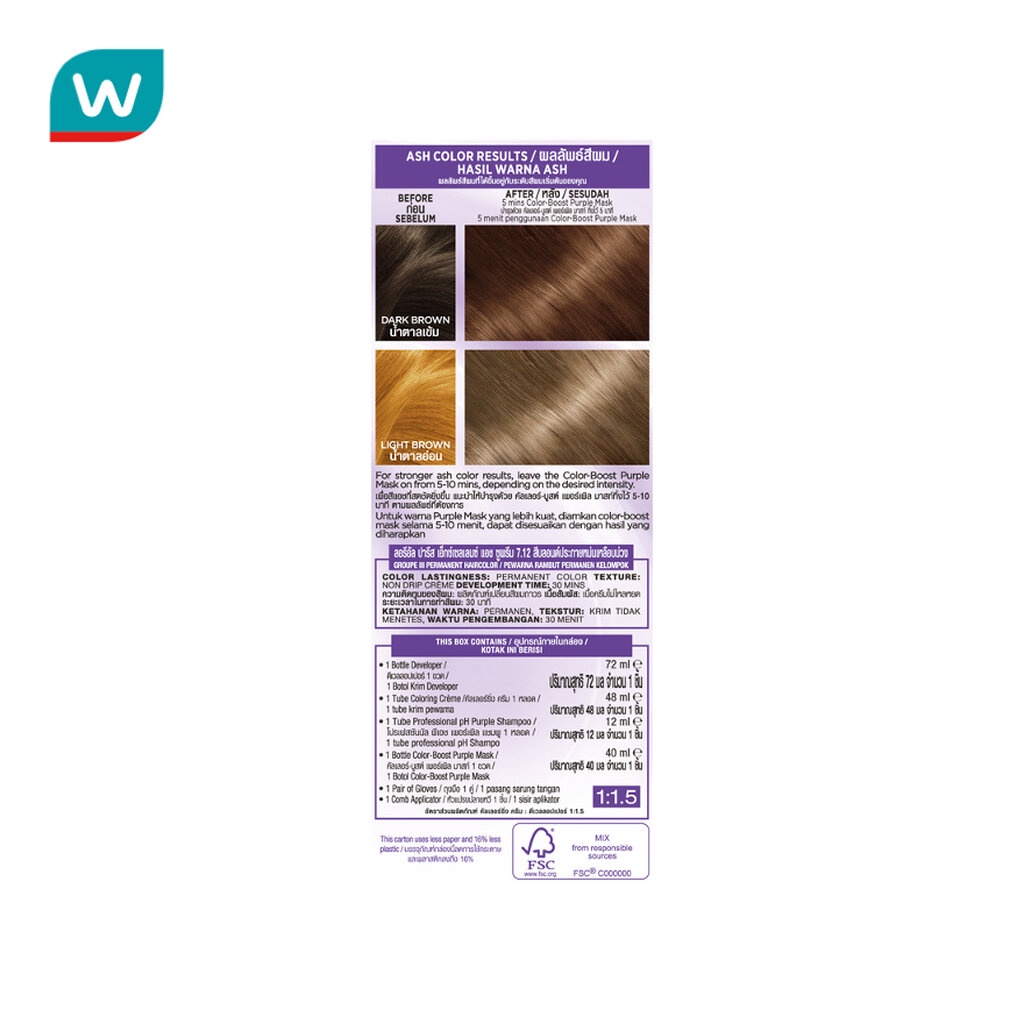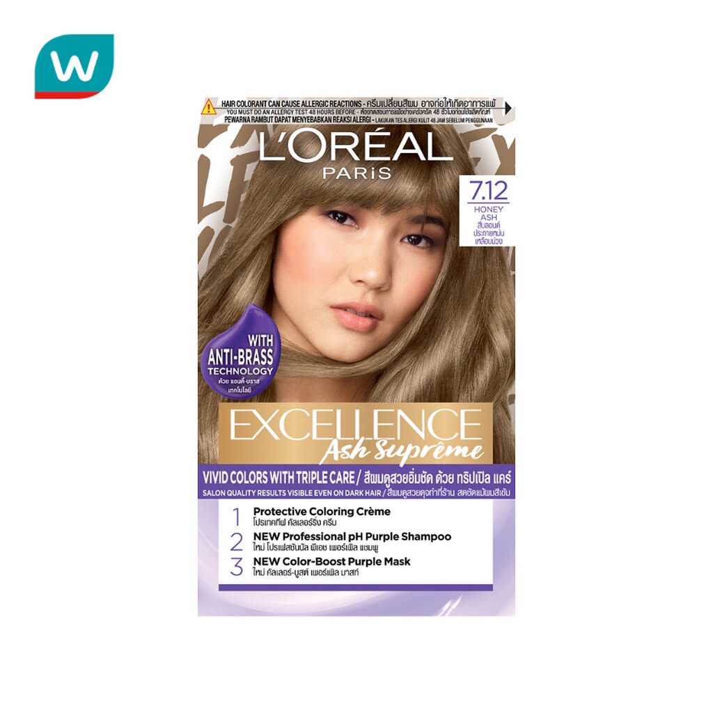 ลอรีอัล ปารีส เอ็กซ์เซลเลนซ์ แอช ซูพรีม 7.12 ฮันนี่ แอช สีบลอนด์ประกายหม่นเหลือบม่วง สีผมดูสวยดุจทำที่ร้าน สดชัดแม้ผมสีเข้ม พร้อม คัลเลอร์-บูสต์ ให้ประกายสีแอชสดชัดขึ้นทันทีหลังใช้ ติดทนนาน และ แอนตี้-บราส เทคโนโลยี ช่วยลดสีซีดเหลืองหรือ
