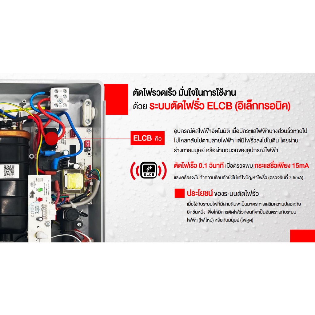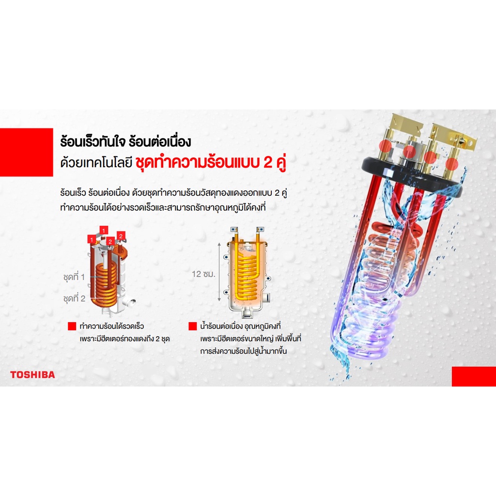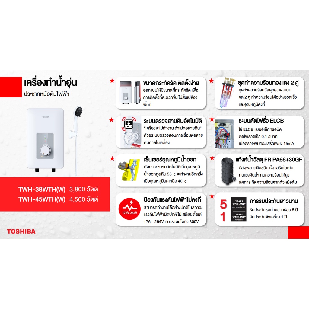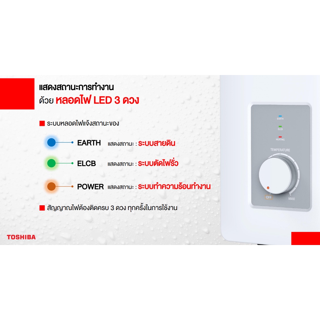 เครื่องทำน้ำอุ่นมาตรฐานจากแบรนด์ TOSHIBA ดีไซน์ทันสมัยติดตั้งเข้ากับห้องน้ำทุกสไตล์ มาพร้อมระบบความปลอดภัย ELCB ที่ตัดไฟเมื่อไฟรั่ว และระบบตรวจสอบการเชื่อมต่อสายดินอัตโนมัติ ทั้งยังมีระบบป้องกัน