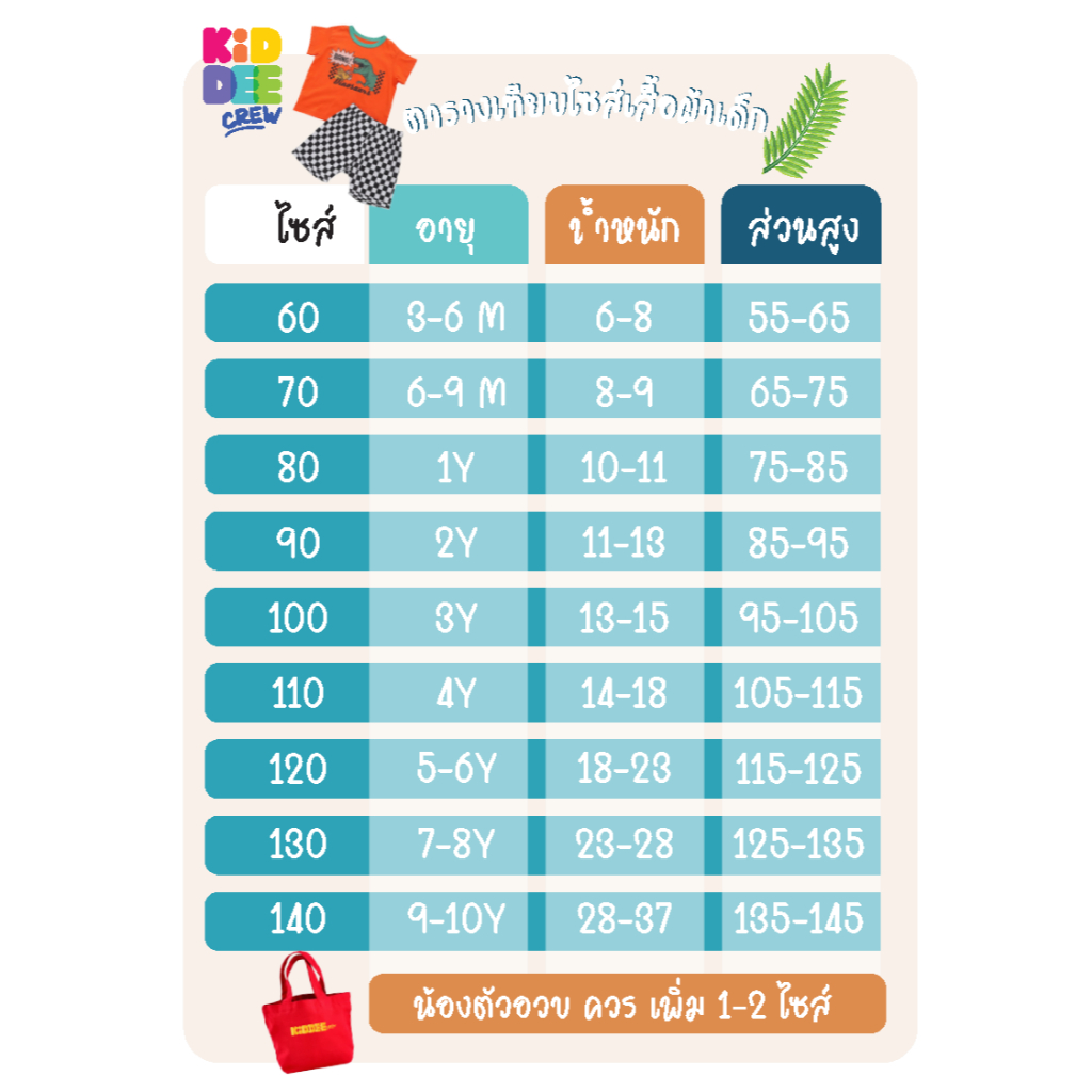 Size 80-130 มี 60 แบบ สนใจดูแบบอื่นเข้าไปที่หมวด ชุดนอนแบรนด์ KiddeeCrew ดูชุดนอนทั้งหมดที่นี่ครับ Shopee.KiddeeCrew(คิดดี้ ครูว์) Size 80 อายุ 1-1 ขวบครึ่ง สูง 75-85 cm น้ำหนัก 10-11 kg เสื้อยาว 37 cm รอบอก 49-51 cm กางเกงยาว 43.5 cm Size 90 อายุ 2-3