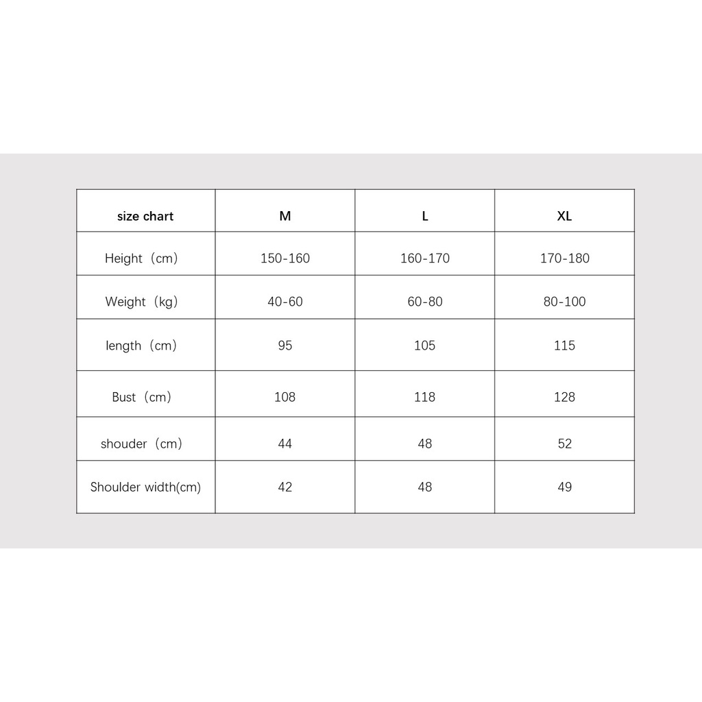 | Model | white(สีขาว), M(150~160CM), white(สีขาว), L160~170CM), gray(สีเทา), L160~170CM), dark blue(สีกรมท่า), M(150~160CM), dark blue(สีกรมท่า), L160~170CM), dark blue(สีกรมท่า), XL(170~180CM), light blue(ฟ้าอ่อน), L160~170CM), pink(สีชมพู), L160~170CM), pink(สีชมพู), XL(170~180C |