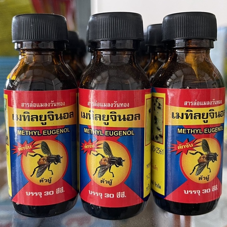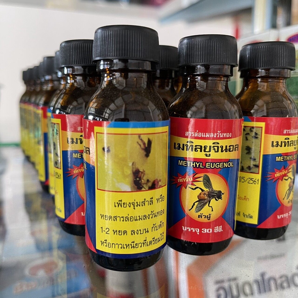 ชื่อสินค้า:เมทิลยูจินอล ( สารล่อแมลงวันทอง ) ชื่อสามัญ:สารเพิ่มประสิทธิภาพ คุณสมบัติ: Methyl Eugenol ดักจับแมลงวันทองตัวผู้