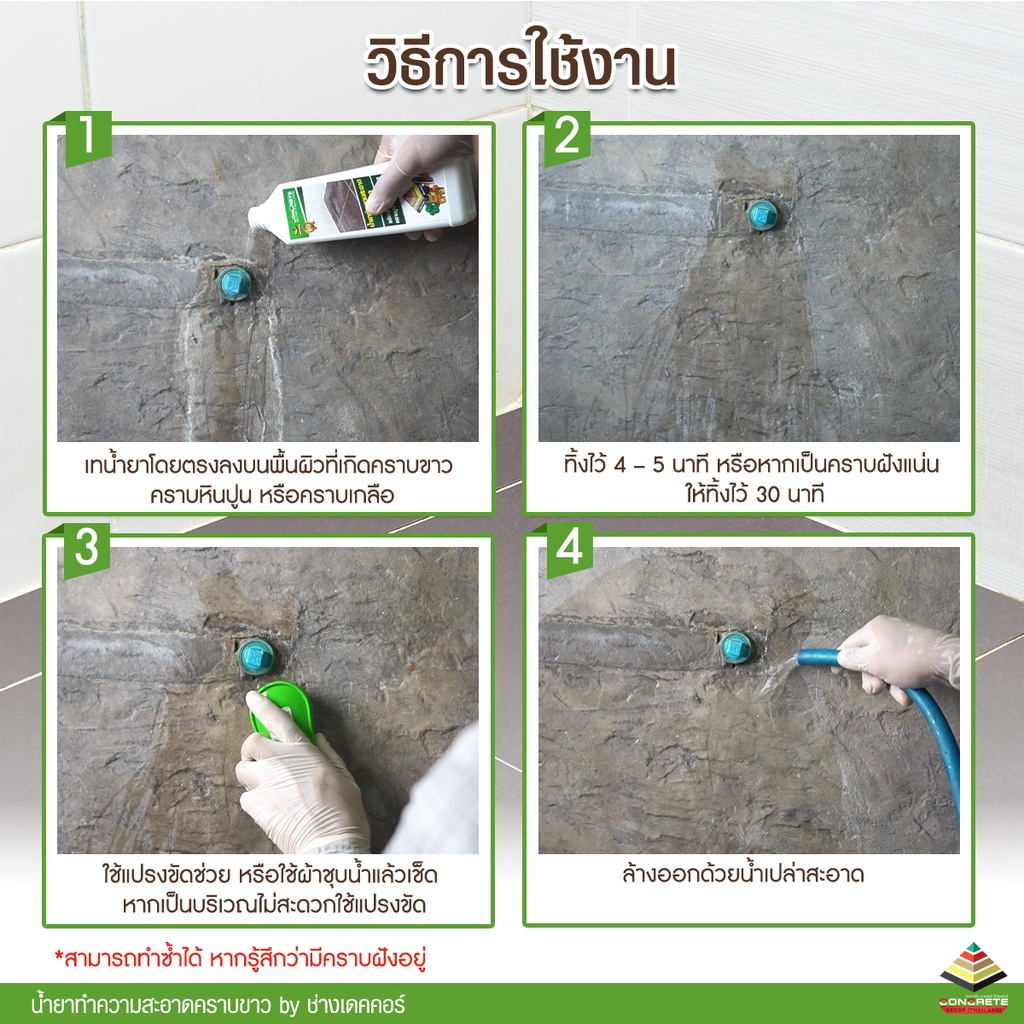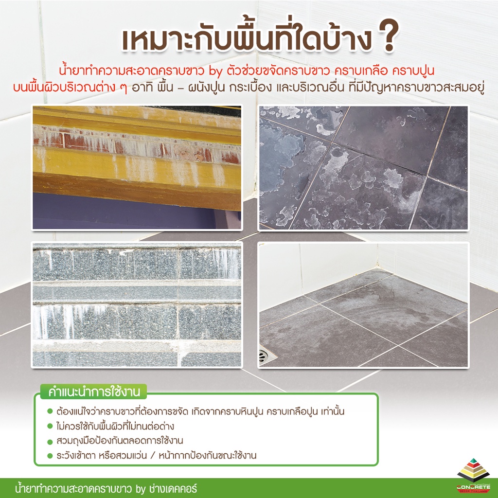 น้ำยาทำความสะอาดคราบขาว จะทำปฏิกิริยากับคราบปูนหรือคราบขาว ที่เกิดจากความชื้นระหว่างน้ำ และคราบเกลือที่อยู่ในพื้นผิว โดยไม่ทำลายพื้นผิวกระเบื้อง หรือหินธรรมชาติ