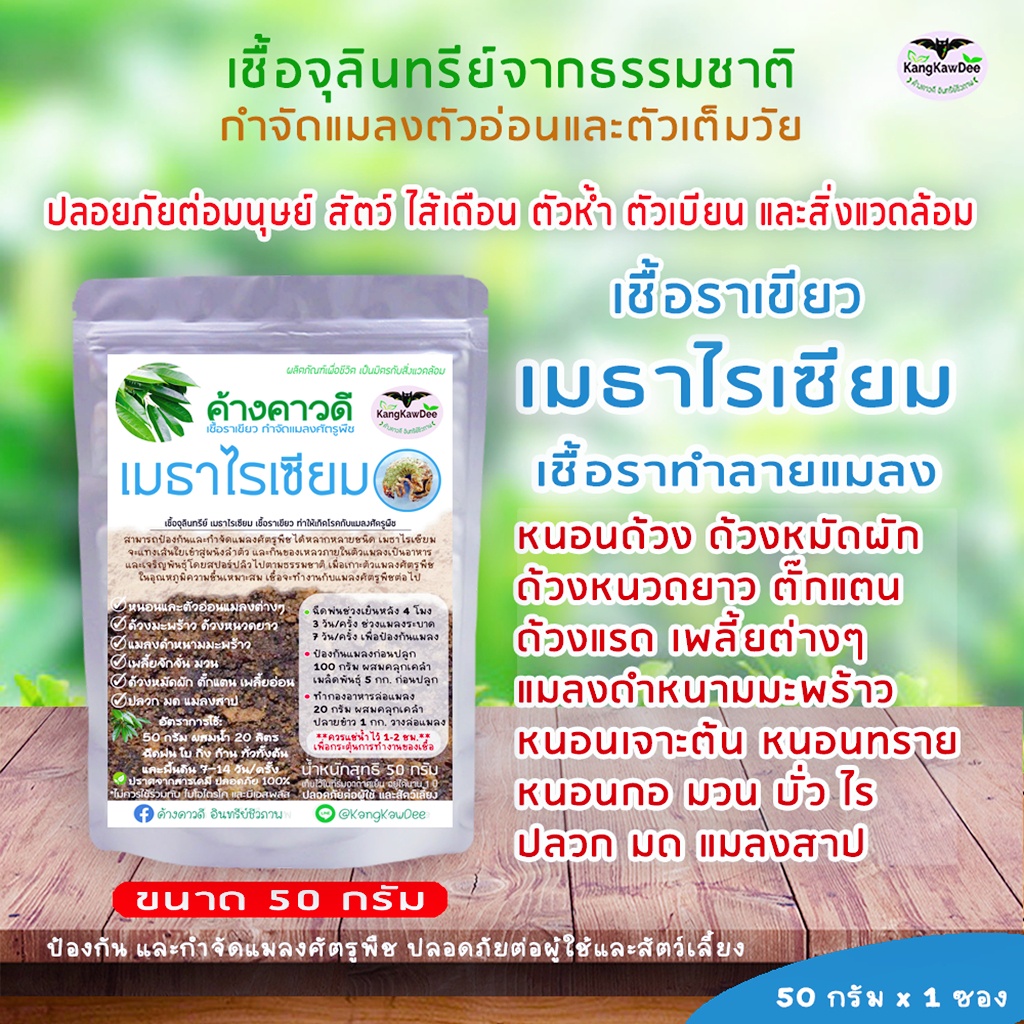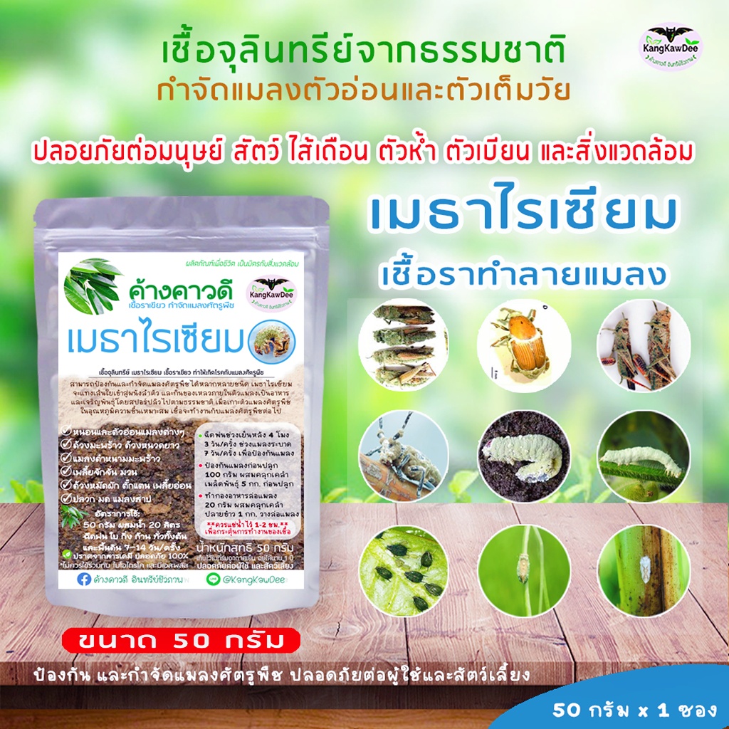 เชื้อราเมธาไรเซียม เมื่อเจริญเติบโตเต็มที่จะมีสีเขียวหม่น พบทั่วไปในดิน มีชีวิตอยู่ในดินได้นาน ทำให้มีระยะการควบคุ