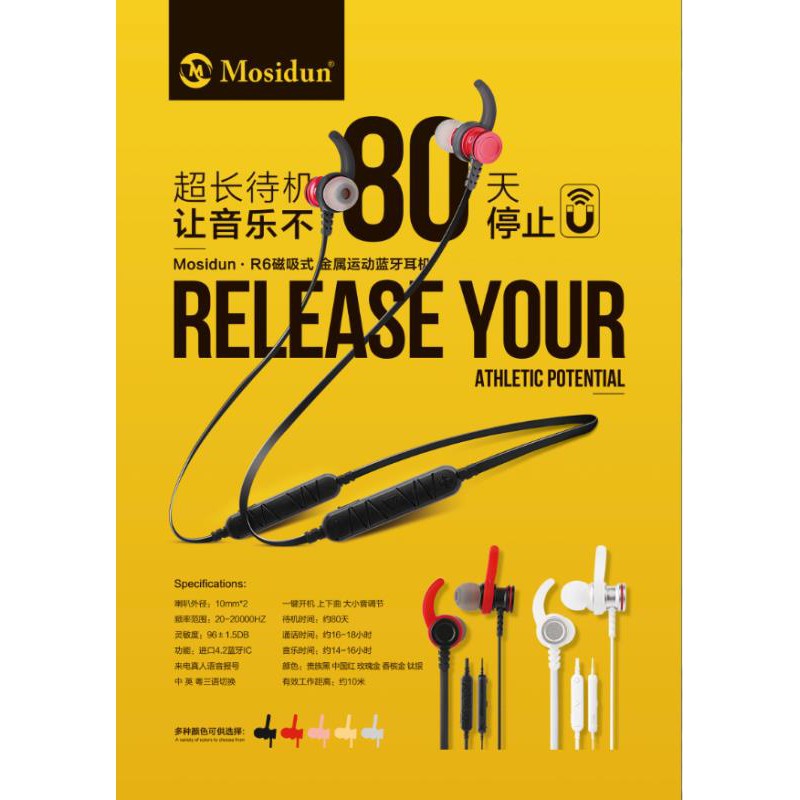 รายละเอียดสินค้า Mosidun R6 Wireless Smart Sport Stero Earphones Bluetooth headset Running Stereo In-ear headphones ของแท้100% new ใช้งานต่อเนื่องได้ถึง 16 ชั่วโมง เสียงดี ฟังเพลงเพราะ กันเหงื่อ กันฝนเหมาะสำหรับใส่ออกกำลังกาย เล่นกีฬาทุกชนิด