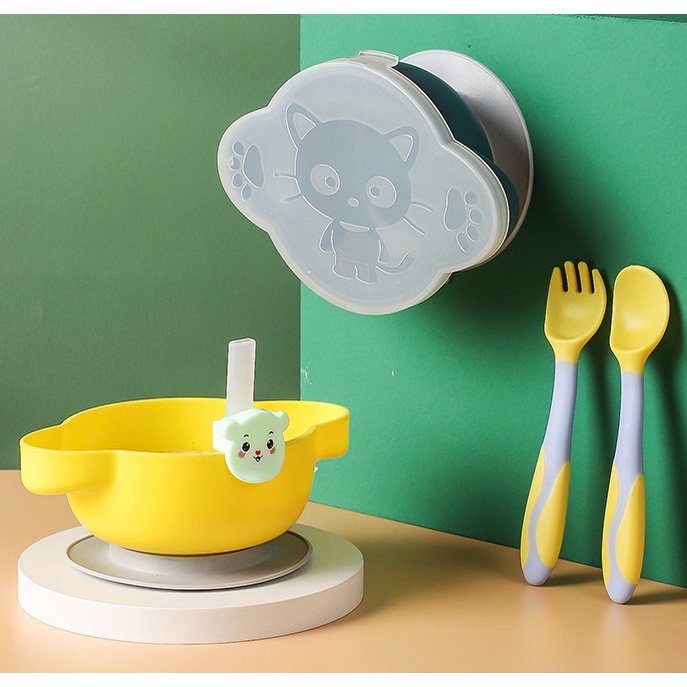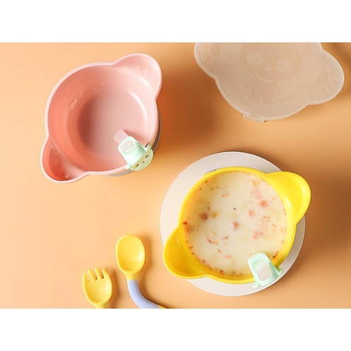 เซ็ตชามข้าวเด็กก้นดูดมีฝาปิด พร้อมช้อนส้อม+หลอดดูดซุป