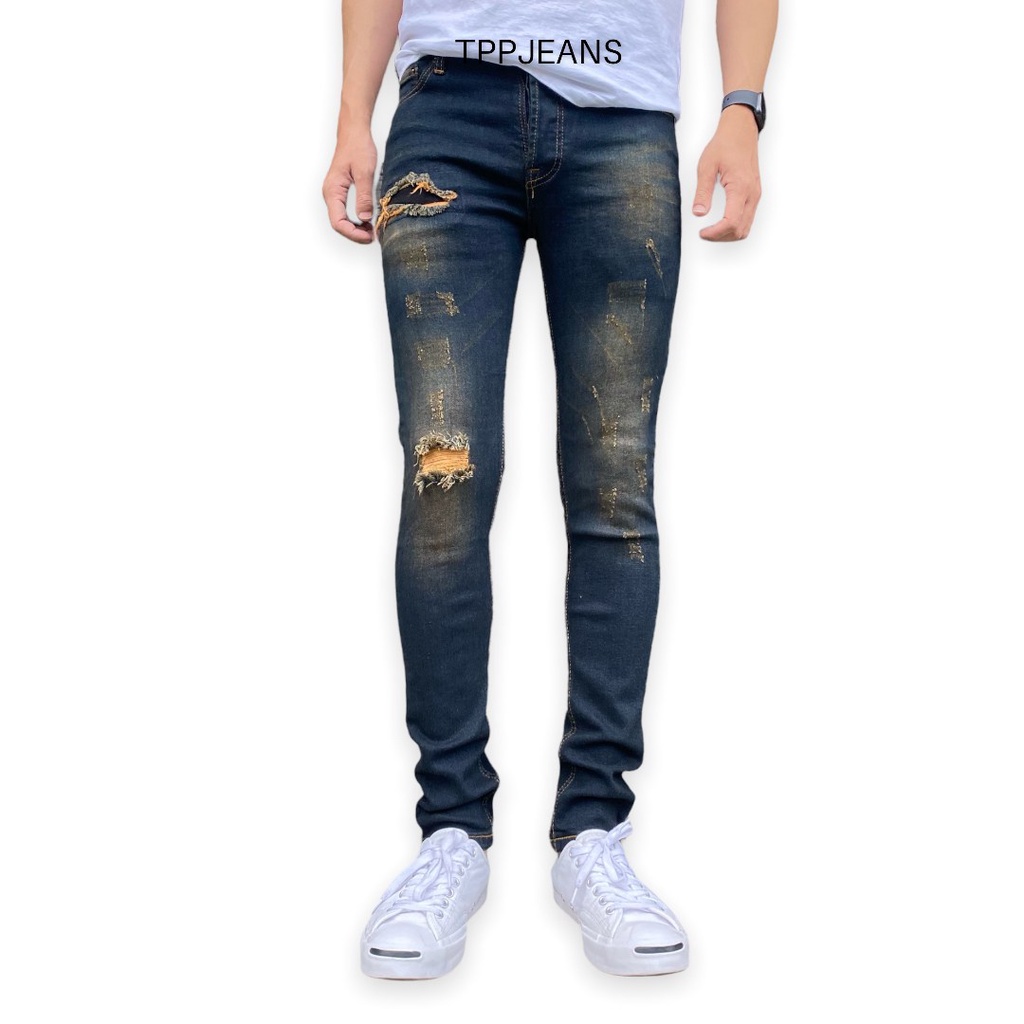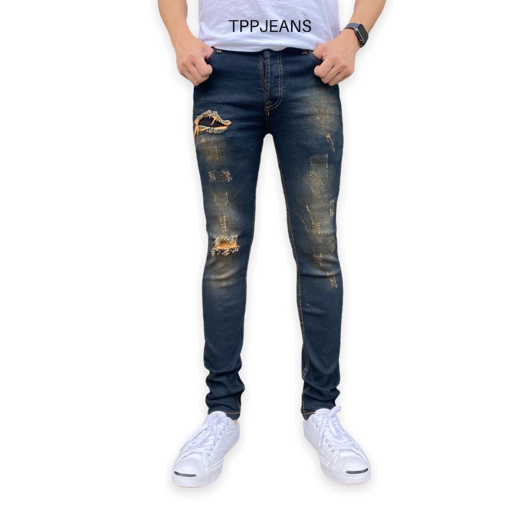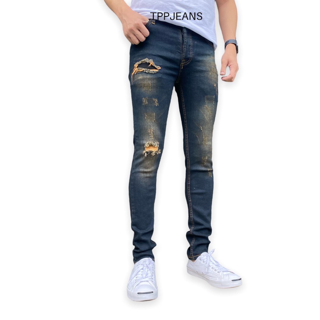 – กางเกงยีนส์สกินนี่ยีนส์ชายสีบลูฟอกสนิมแต่งขาด เป้ากระดุม