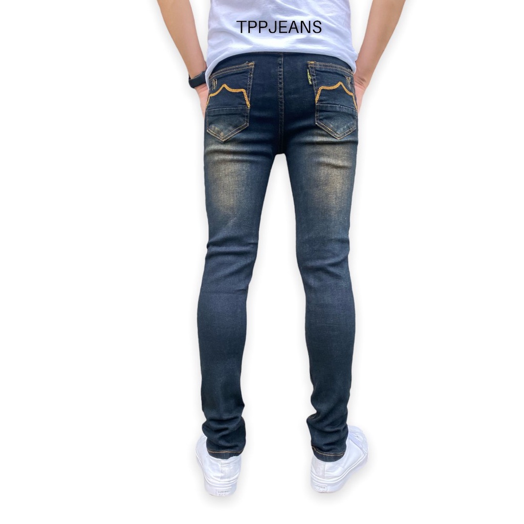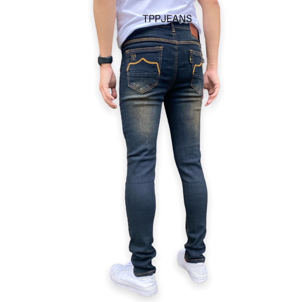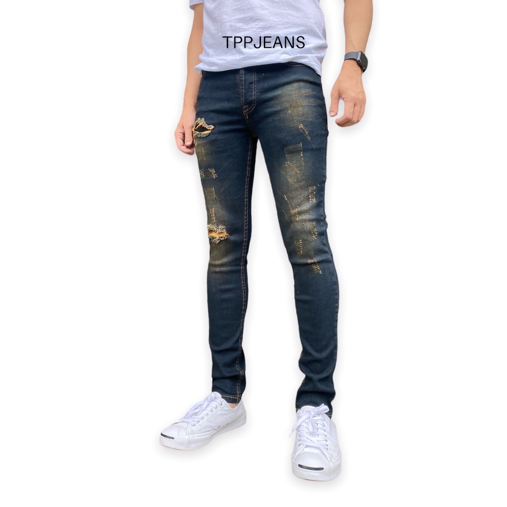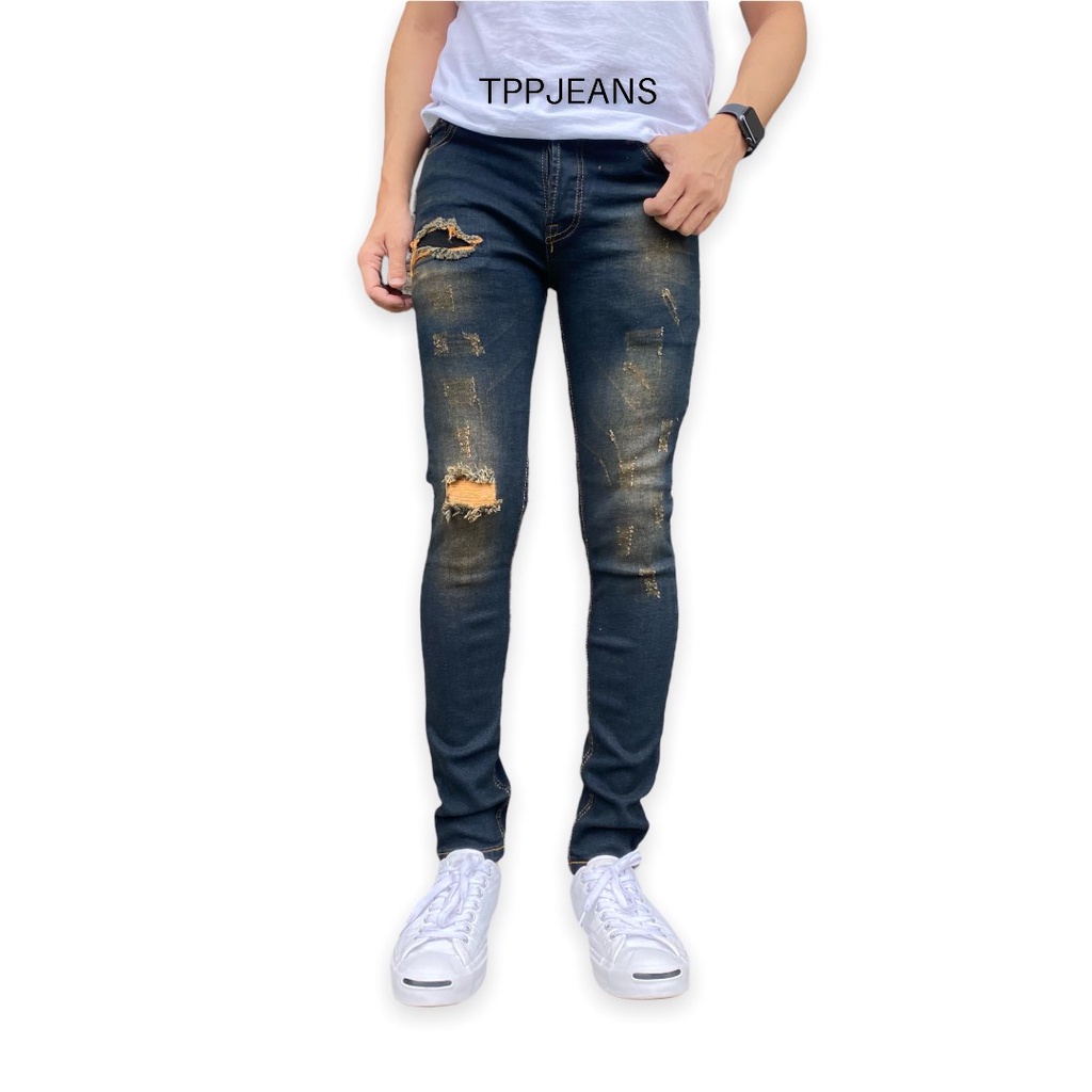 – กางเกงยีนส์สกินนี่ยีนส์ชายสีบลูฟอกสนิมแต่งขาด เป้ากระดุม
