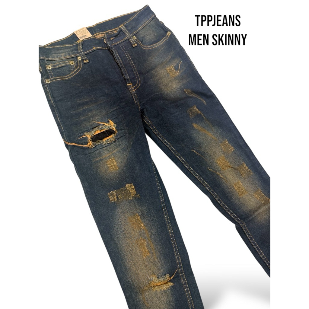JEANSEXPRESS Skinny Men's กางเกงยีนส์ชายสีบลูฟอกสนิม แต่งขาด ทรงสกินนี่ เป้ากระดุม Size 26-36 รับชำระปลายทาง