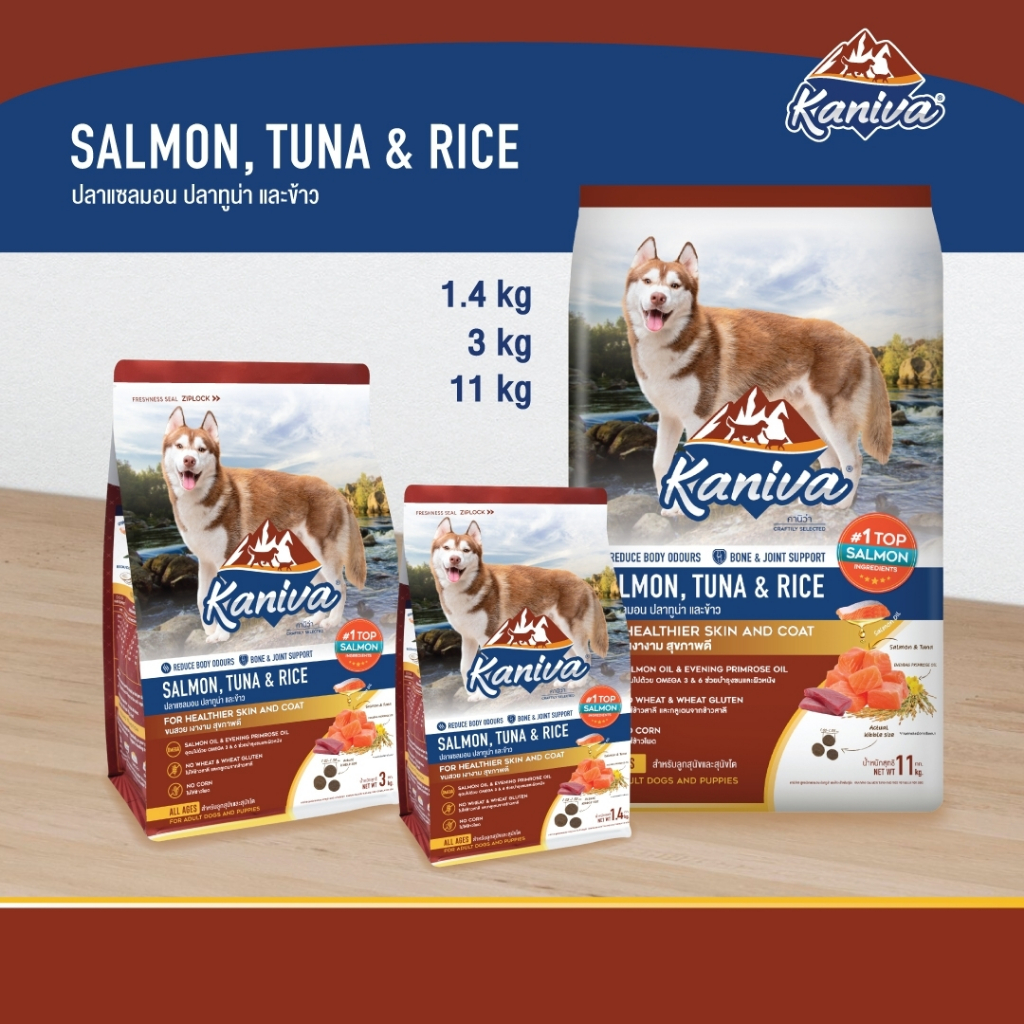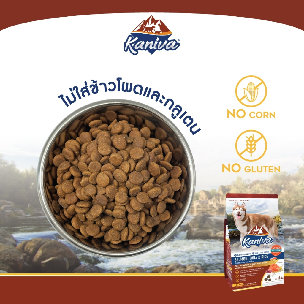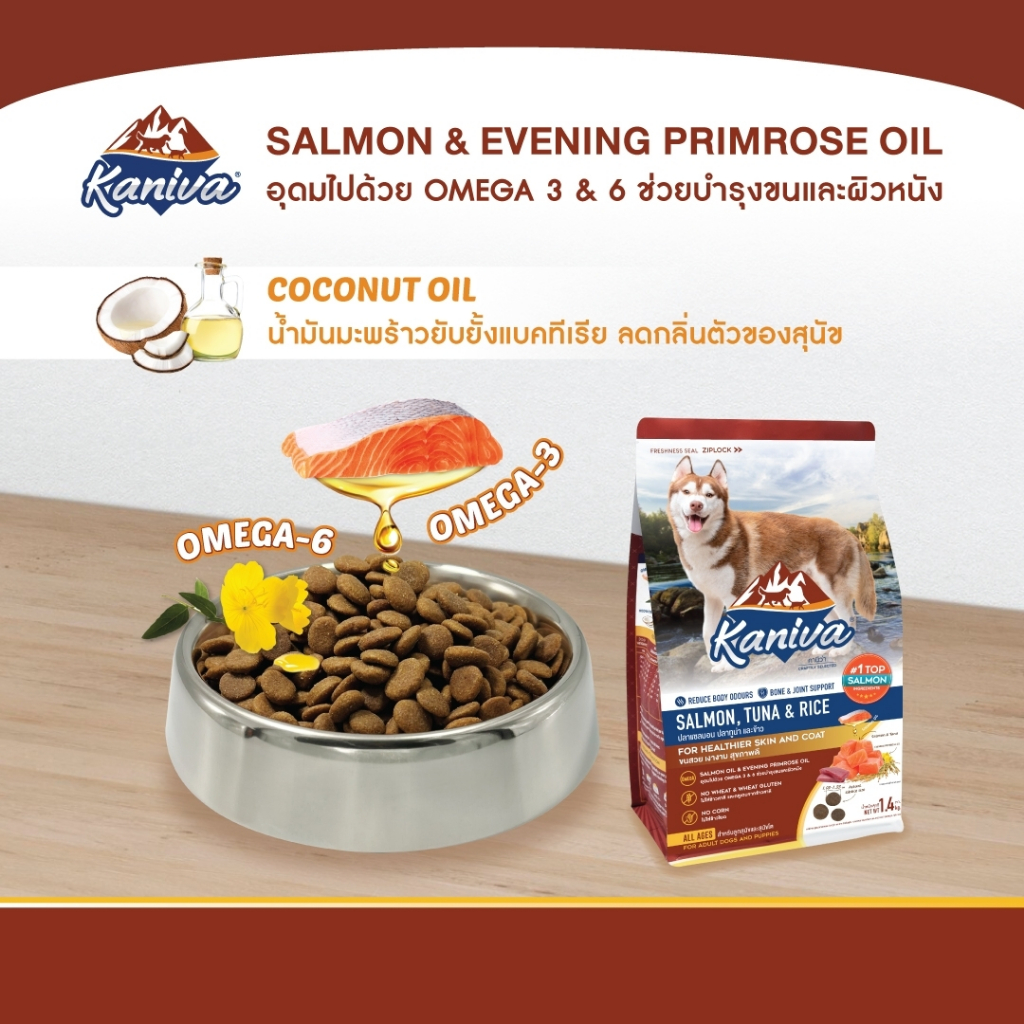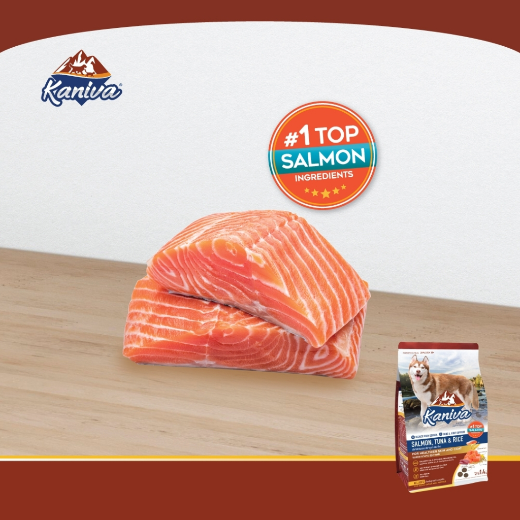 Kaniva Salmon 1.4 Kg. อาหารสุนัข สูตรเนื้อปลาแซลมอน ปลาทูน่าและข้าว ช่วยให้ขนนุ่ม สวย เงางาม สำหรับสุนัข 4 เดือนขึ้นไป
