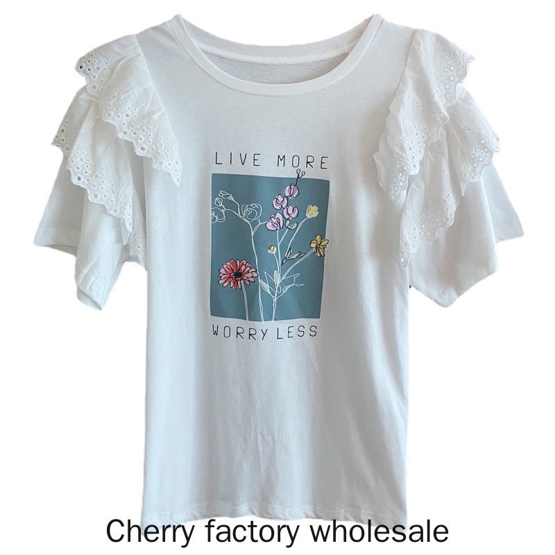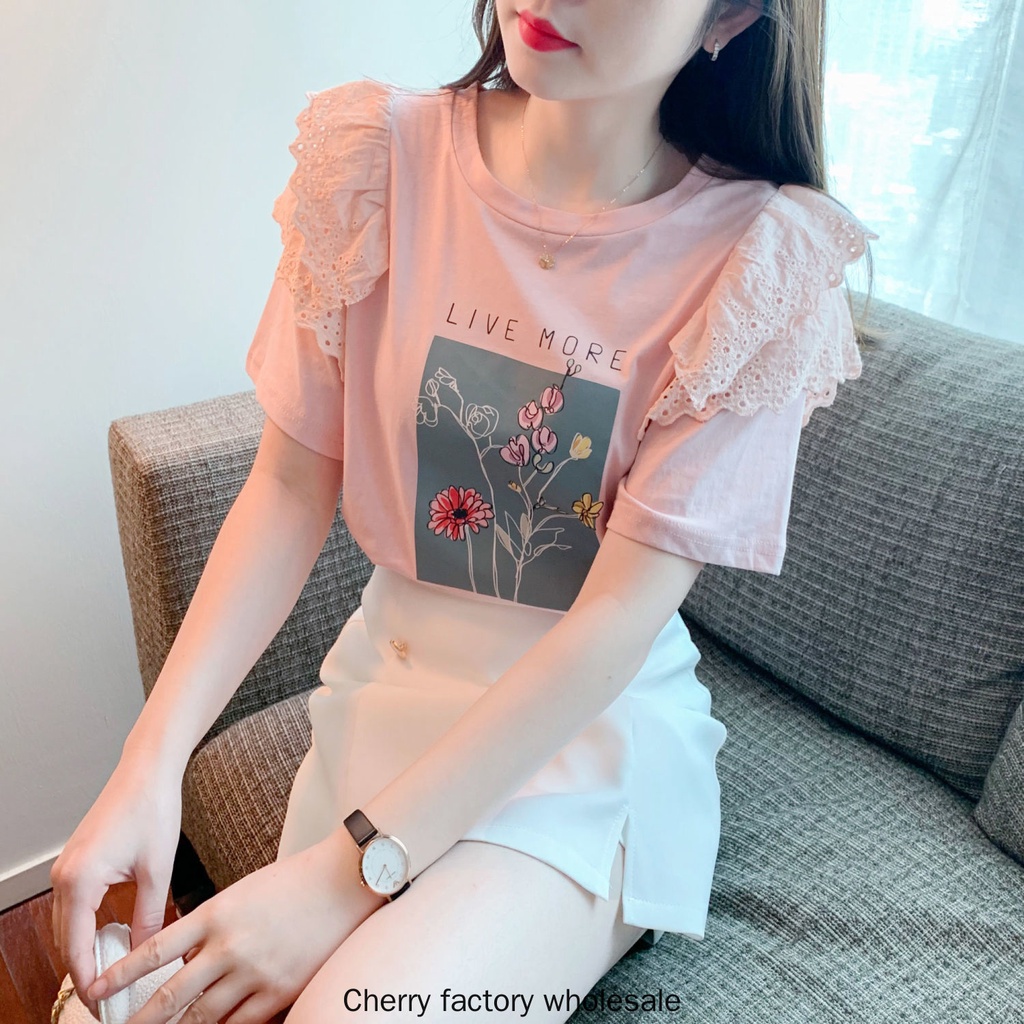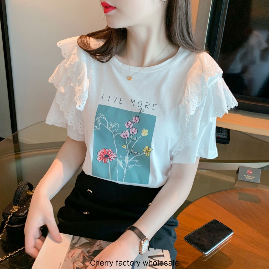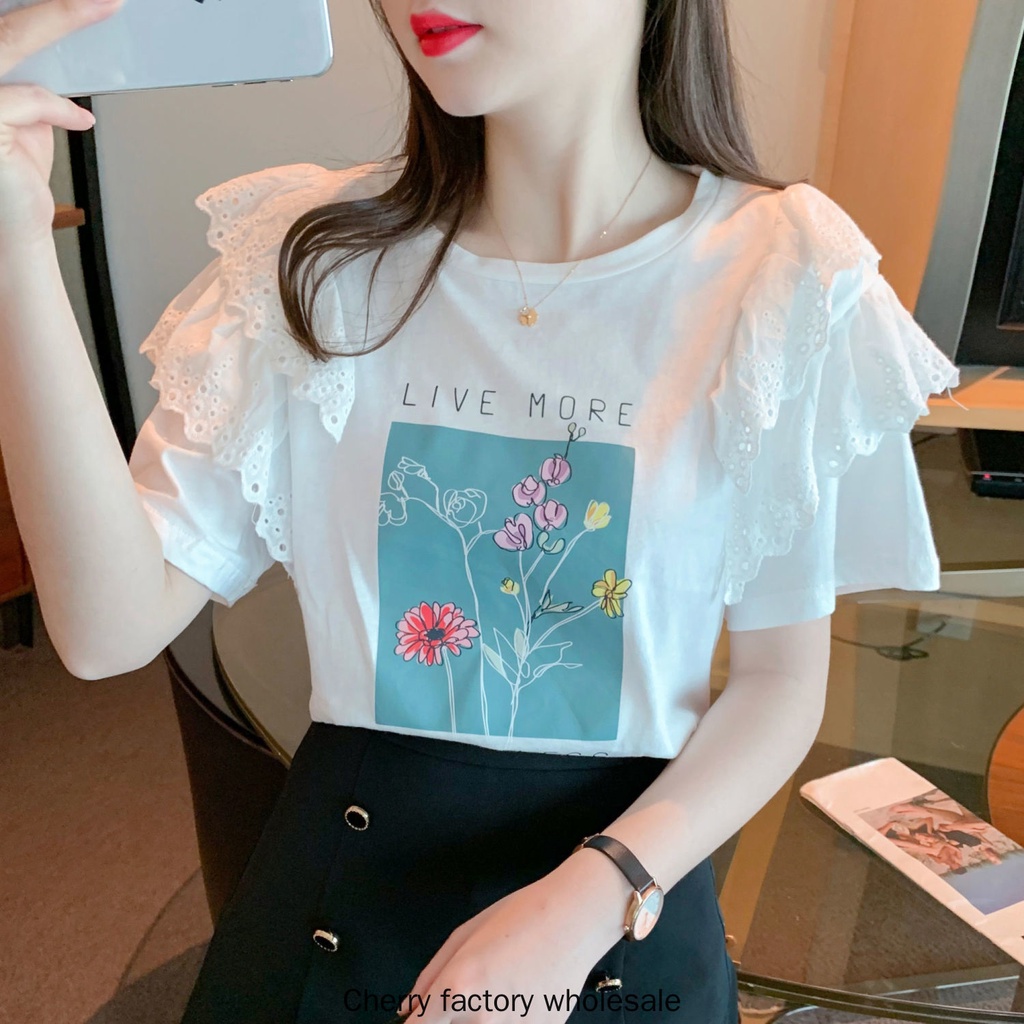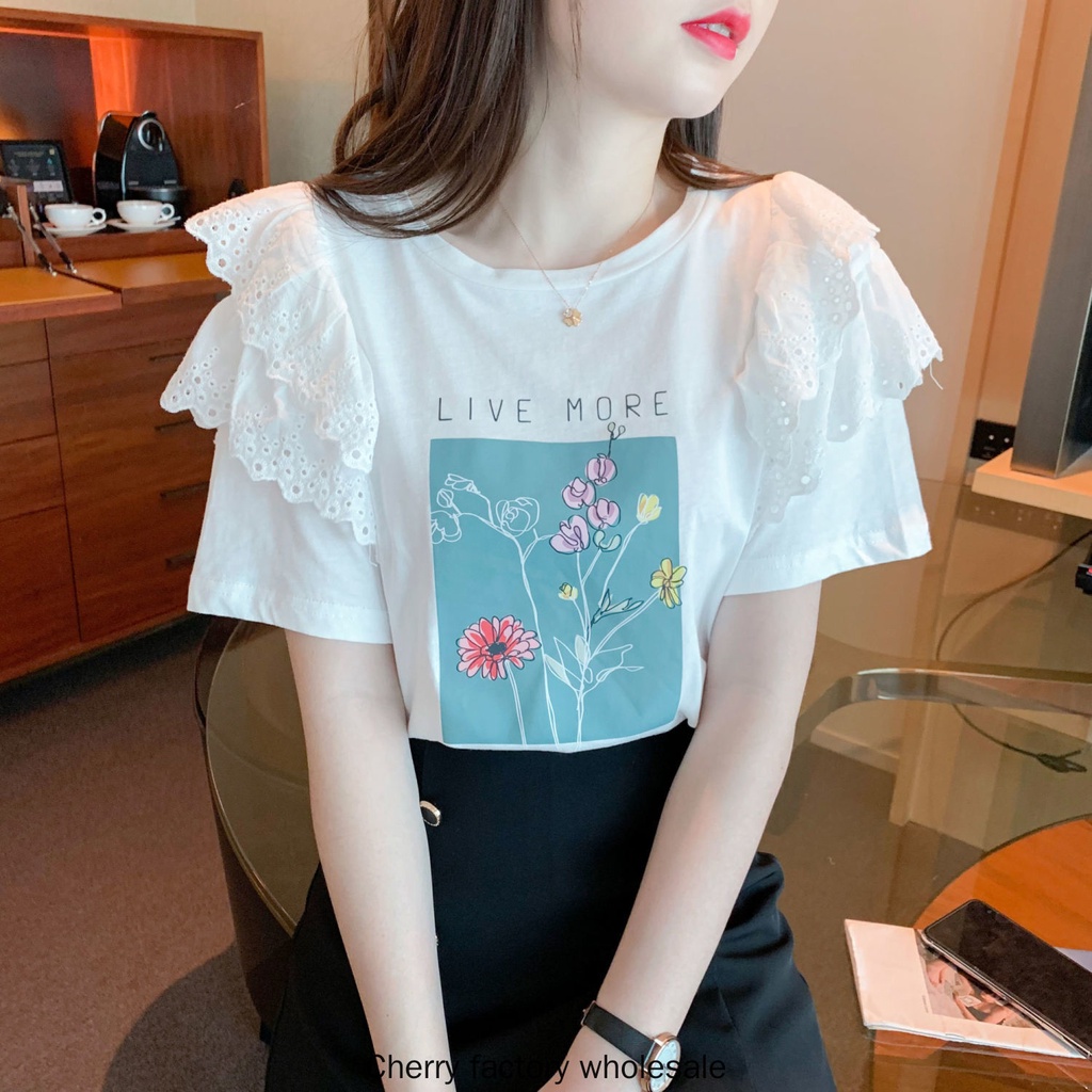 เสื้อยืดแขนสั้น ผ้าฝ้าย พิมพ์ลายลูกไม้ แบบเข้ารูป แฟชั่นทันสมัย สําหรับผู้หญิง