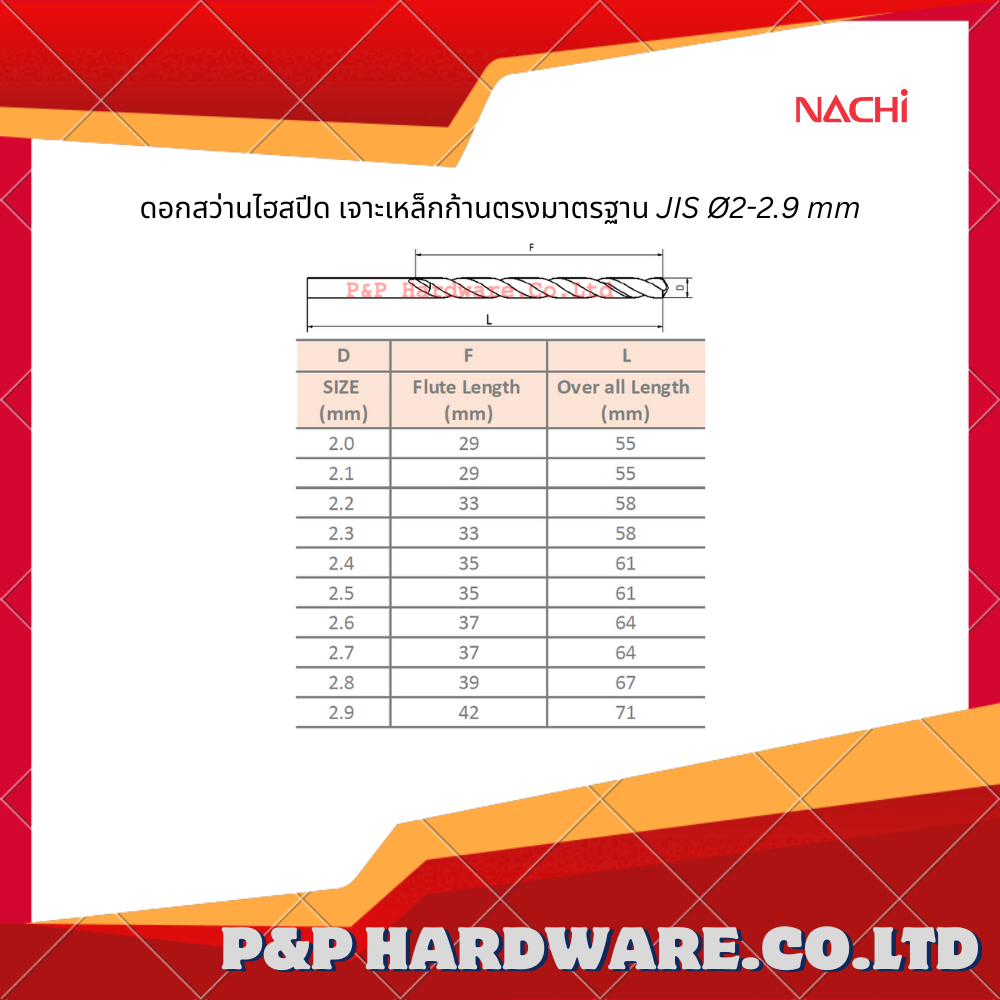 ดอกสว่านไฮสปีด เจาะเหล็กก้านตรง มาตรฐาน JIS Ø2-2.9 mm นาชิ NACHI