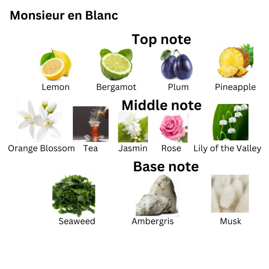 Middle: Orange blossom, Tea, Jasmin, Rose, Lily of the valley