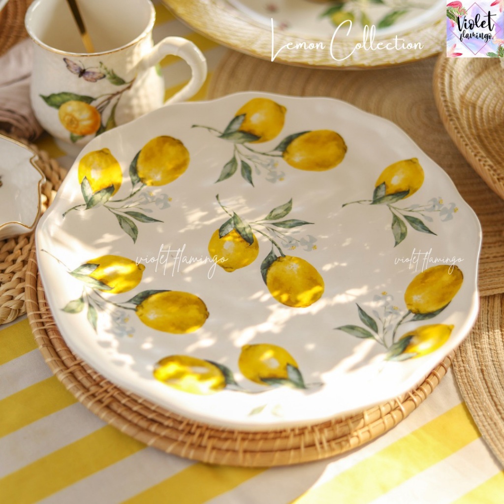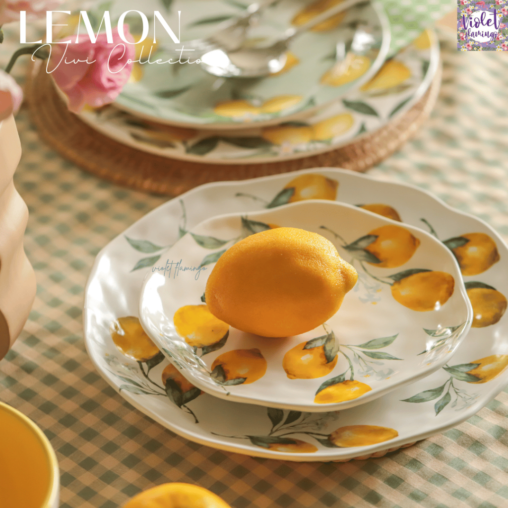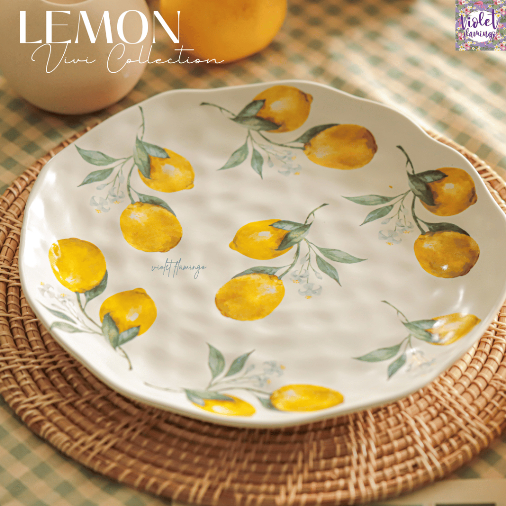 หยิบใส่ตะกร้าViolet Flamingo [พร้อมส่งจากไทย] จานลายเลมอน จานเซรามิคลายเลมอน Lemon Vivi Collection จานเลมอน เข้าไมโครเวฟได้