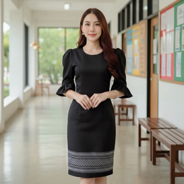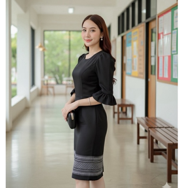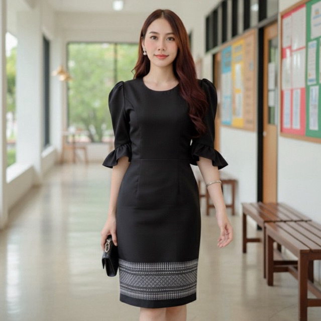 หยิบใส่ตะกร้ารุ่นใหม่ สีดำ 🖤 #เดรสผ้าทออัดกาวทั้งชุด แขนระบายน่ารัก คอกลม