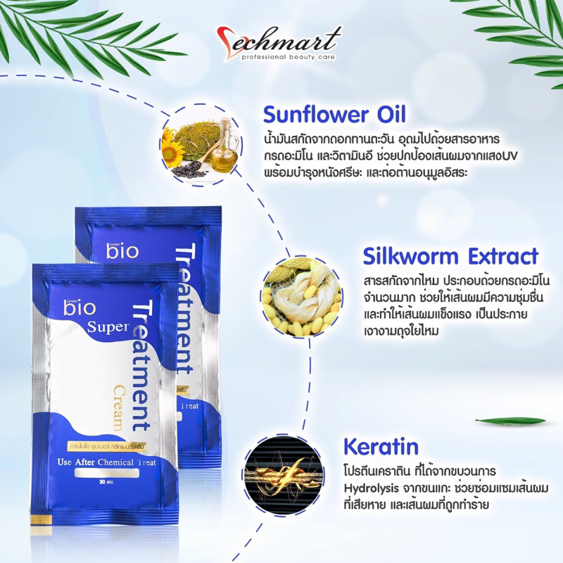 Green Bio super treatment ผสานคุณค่าจากเคราติน สารสกัดจากไหม และน้ำมันดอกทานตะวัน ช่วยปกป้องเส้นผมจากแสง UV ด้วยคุณลักษณะเนื้อครีมที่สามารถซึมลึกสู่เส้นผมได้ ช่วยปรับสภาพเส้นผมหลังการยืด ดัด ย้อม