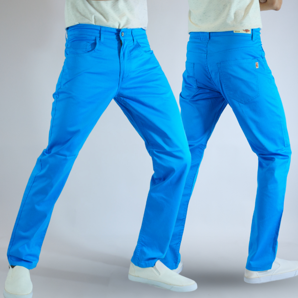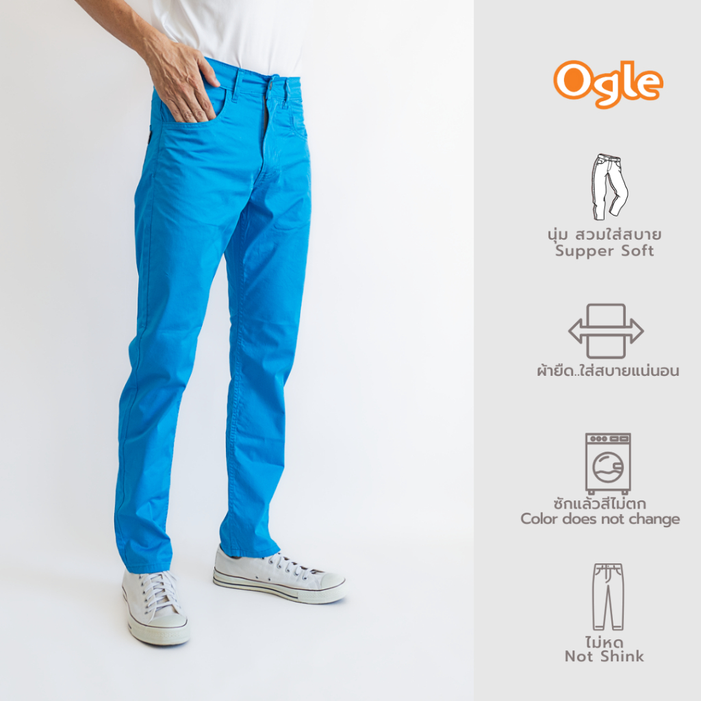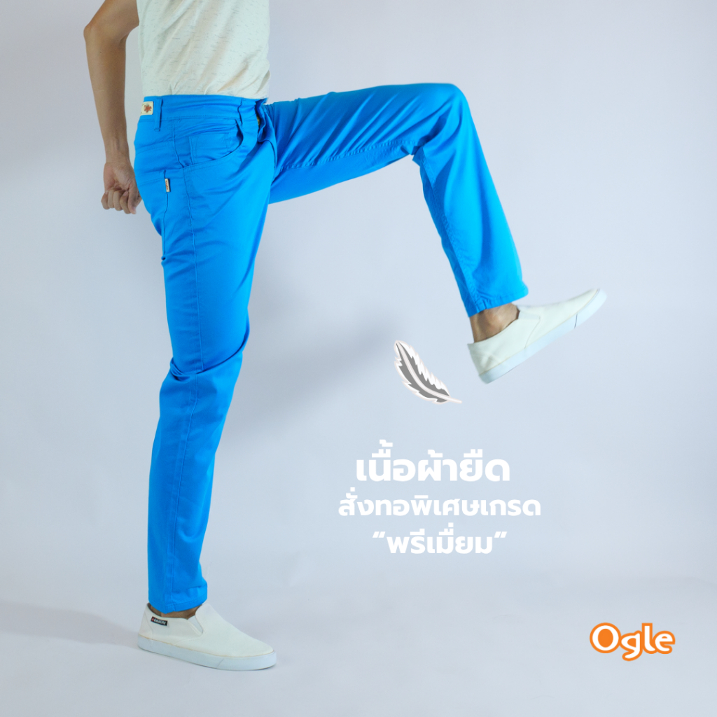 กางเกงชิโน่ยืด กางเกงขายาวผู้ชาย ขายาวทรงกระบอกเล็ก ผ้าคอตตอนยืด ทรงสวย ฟอกนุ่มมาก สีฟ้า