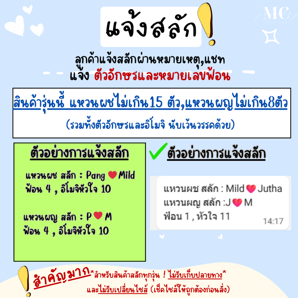ชาย 6 us, หญิง 7 us, สลัก (ไม่รับปลายทาง), ชาย 6 us, หญิง 8 us, ไม่สลักแหวน, ชาย 6 us, หญิง 8 us, สลัก (ไม่รับปลายทาง), ชาย 6 us, หญิง 9 us, ไม่สลักแหวน, ชาย 6 us, หญิง 9 us, สลัก (ไม่รับปลายทาง), ชาย 6 us, หญิง 10us, ไม่สลักแหวน, ชาย 6 us, หญิง 10us, สลัก (ไม่