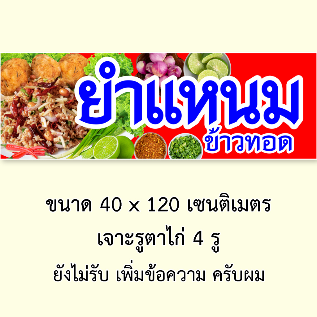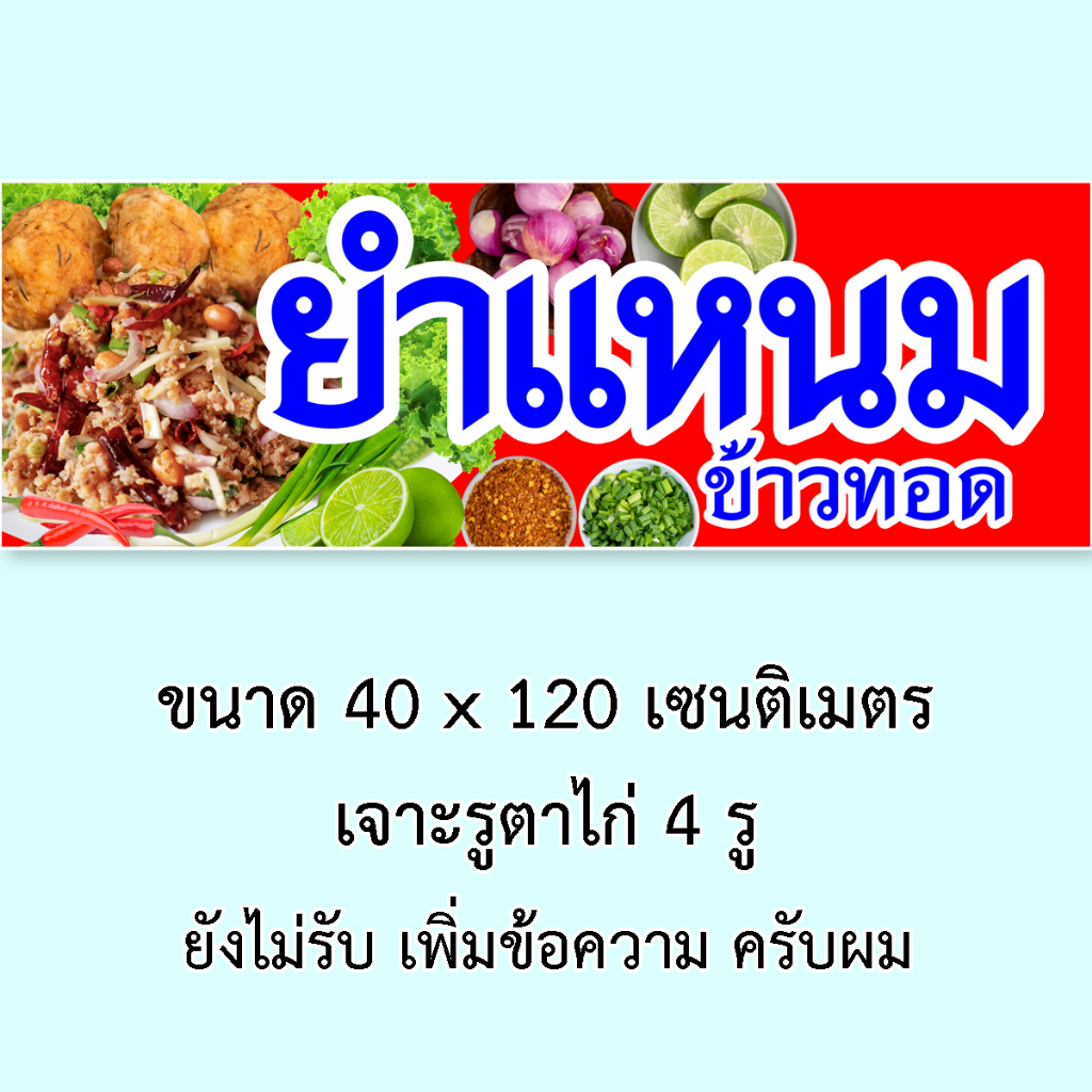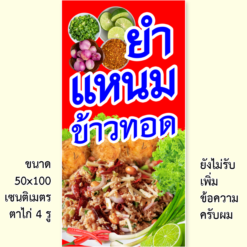 หยิบใส่ตะกร้าป้ายไวนิลยำแหนม ข้าวทอด 1ด้าน ตั้ง 50×100 เซน นอน 40×120 เซน รูตาไก่ 4 มุม มี 2 แบบให้เลือก ป้ายไวนิลยำแหนมข้าวทอด