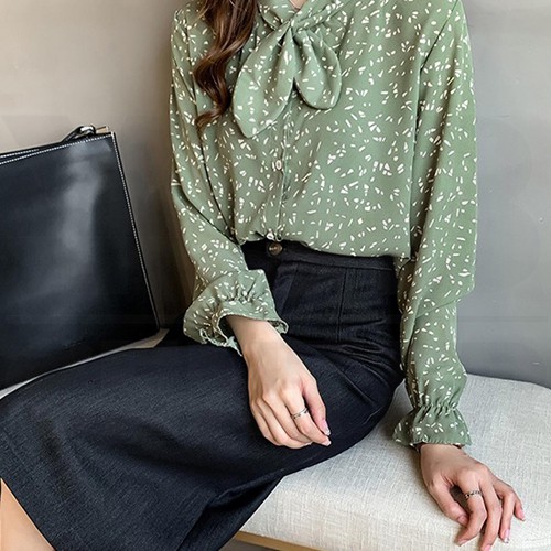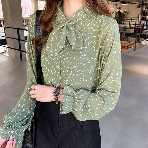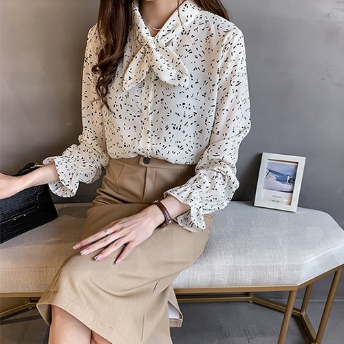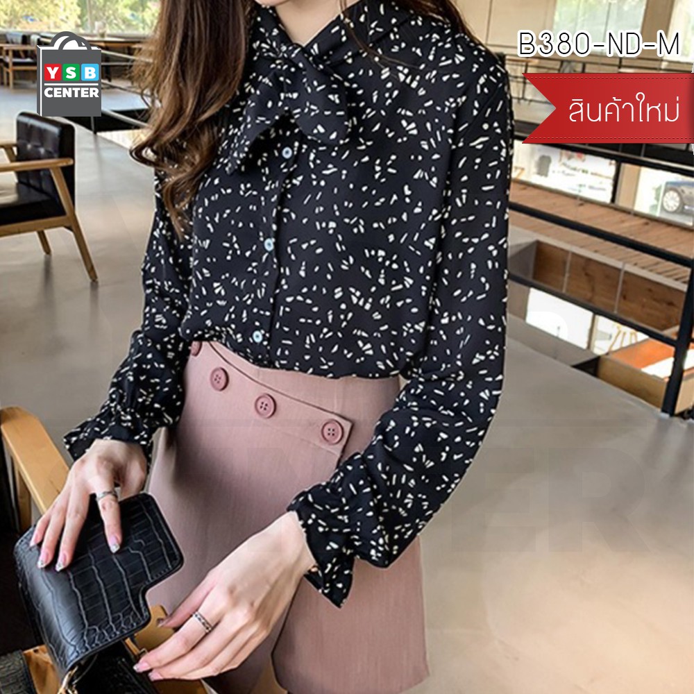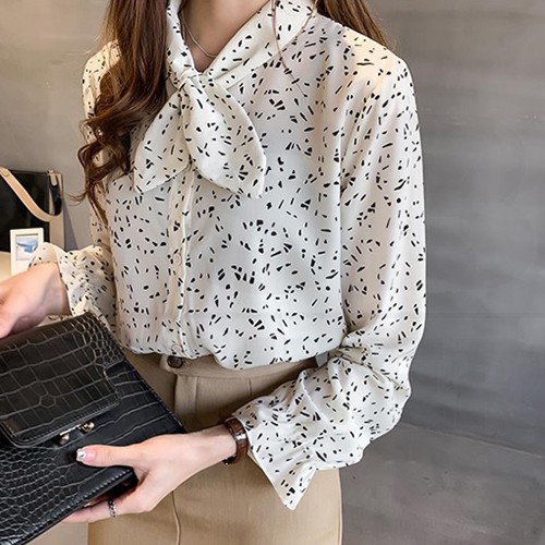 👚 เสื้อเนื้อผ้าโพลีเอสเตอร์ แขนยาว ดีเทลแต่งโบว์ที่ช่วงคอ แขนจั๊ม พิมพ์ลายทั้งตัว เนื้อผ้าดี ผ้านุ่ม ลื่น และ ยืดหยุ่น เนื้อทึบไม่บาง น้ำหนักเบา