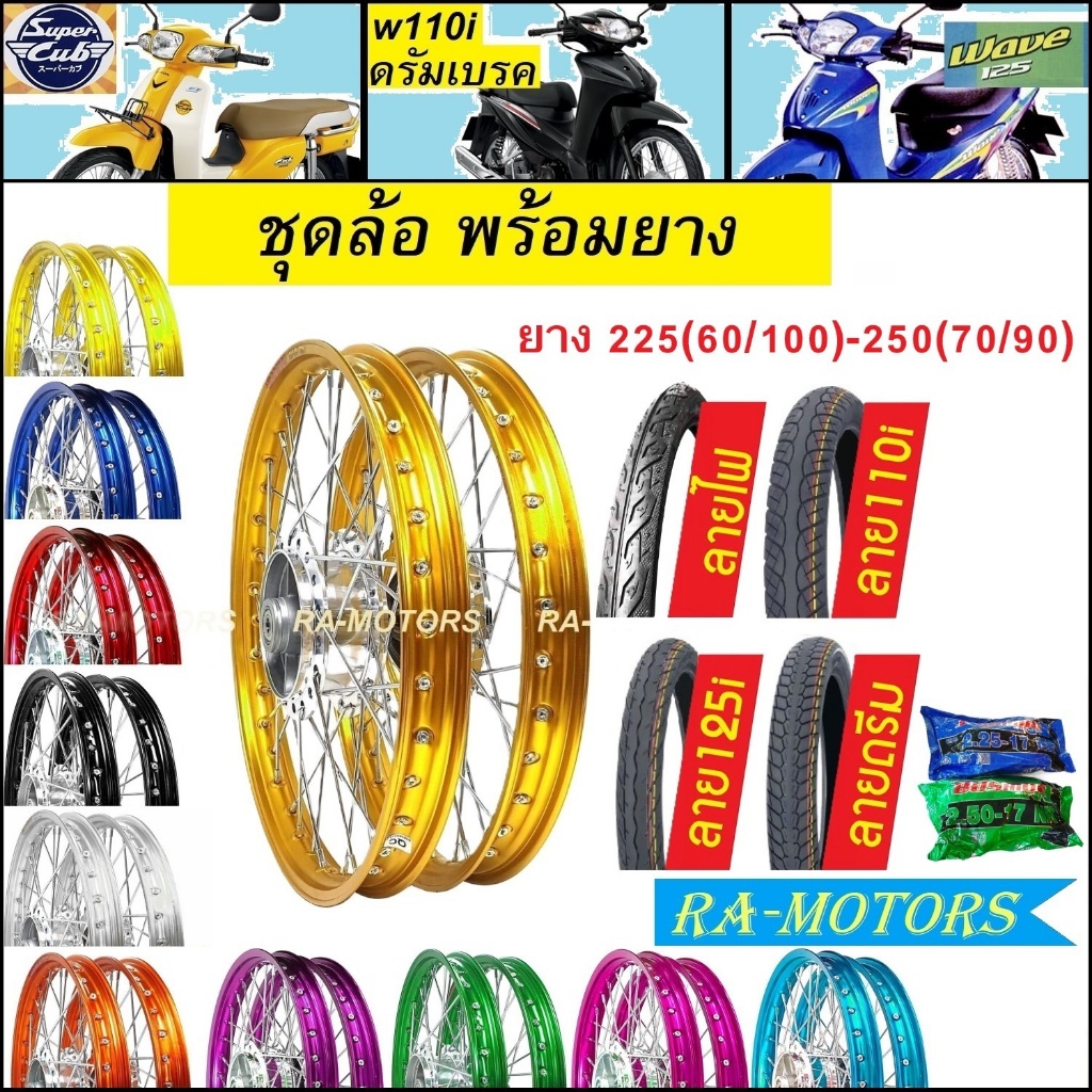 ชุดล้อพร้อมยาง ดรีม ทุกรุ่น และ เวฟ(ดั๊มเบรค) ทุกรุ่นมีลายยางให้เลือก ขนาด225-250 ล้อโล1.4 มีหลายสีให้เลือก อะไหล่แต่ง