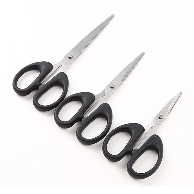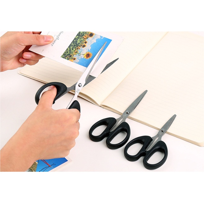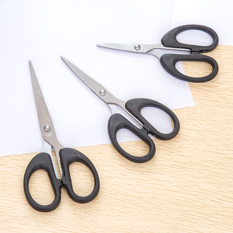 กรรไกรสแตนเลสอเนกประสงค์ ด้ามจับพลาสติกสีดำ ทนทาน มีให้เลือก 3 ขนาด เหมาะสำหรับการใช้งานในบ้าน สำนักงาน และงานประดิษฐ์ต่าง ๆ ด้วยการออกแบบที่สะดวกต่อการใช้งาน