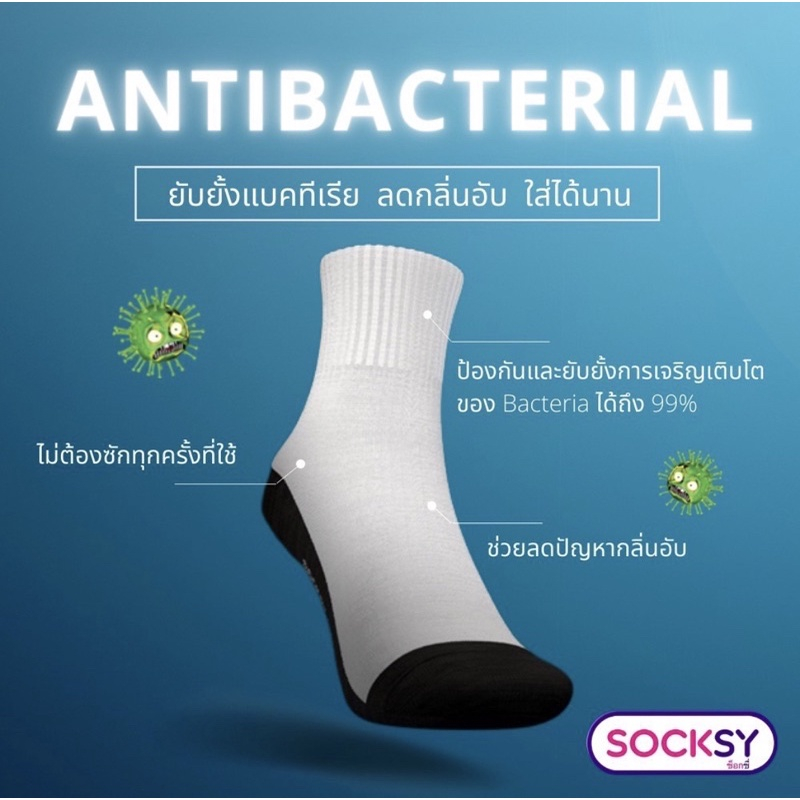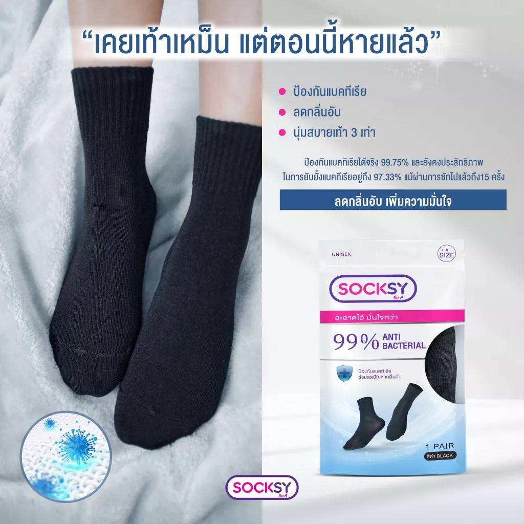 ถุงเท้า Socksy แอนตี้แบคทีเรีย 99% ช่วยลดกลิ่นอับ นุ่มสบายเท้า ตลอดวัน มีทั้งข้อสั้น และข้อกลาง แพ็คละ 1 คู่ [พร้อมส่ง]