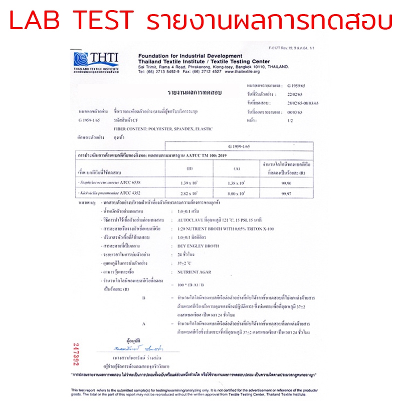 1.เทคโนโลยีจากซิลเวอร์คลอไรด์ ผ่านการทดสอบจากสถาบันแล้วว่าสามารถป้องกันและยับยั้งการเจริญเติบโตของ Bacteria ได้ถึง 99% (อ้างอิงผลการทดสอบจากสถาบัน IMSL ประเทศอังกฤษ และสถาบันทดสอบสิ่งทอ ประเทศไทย)