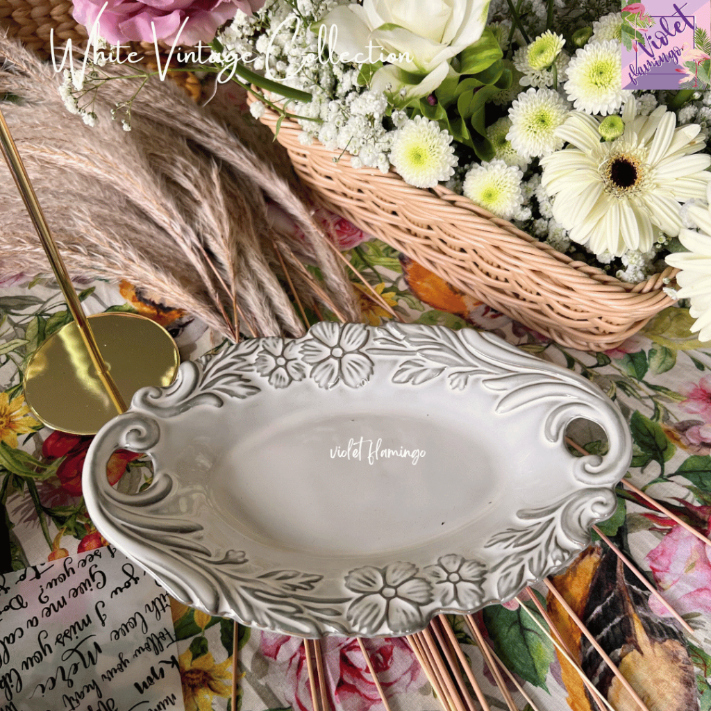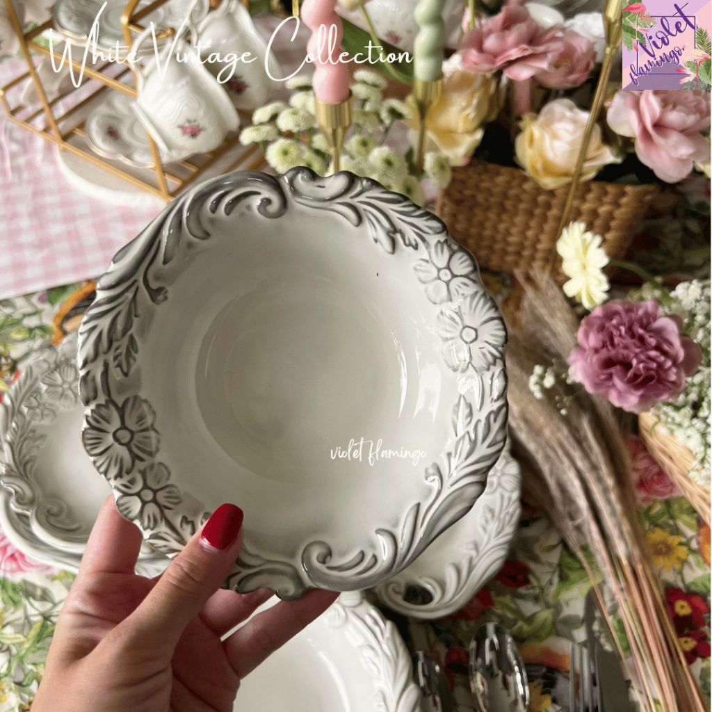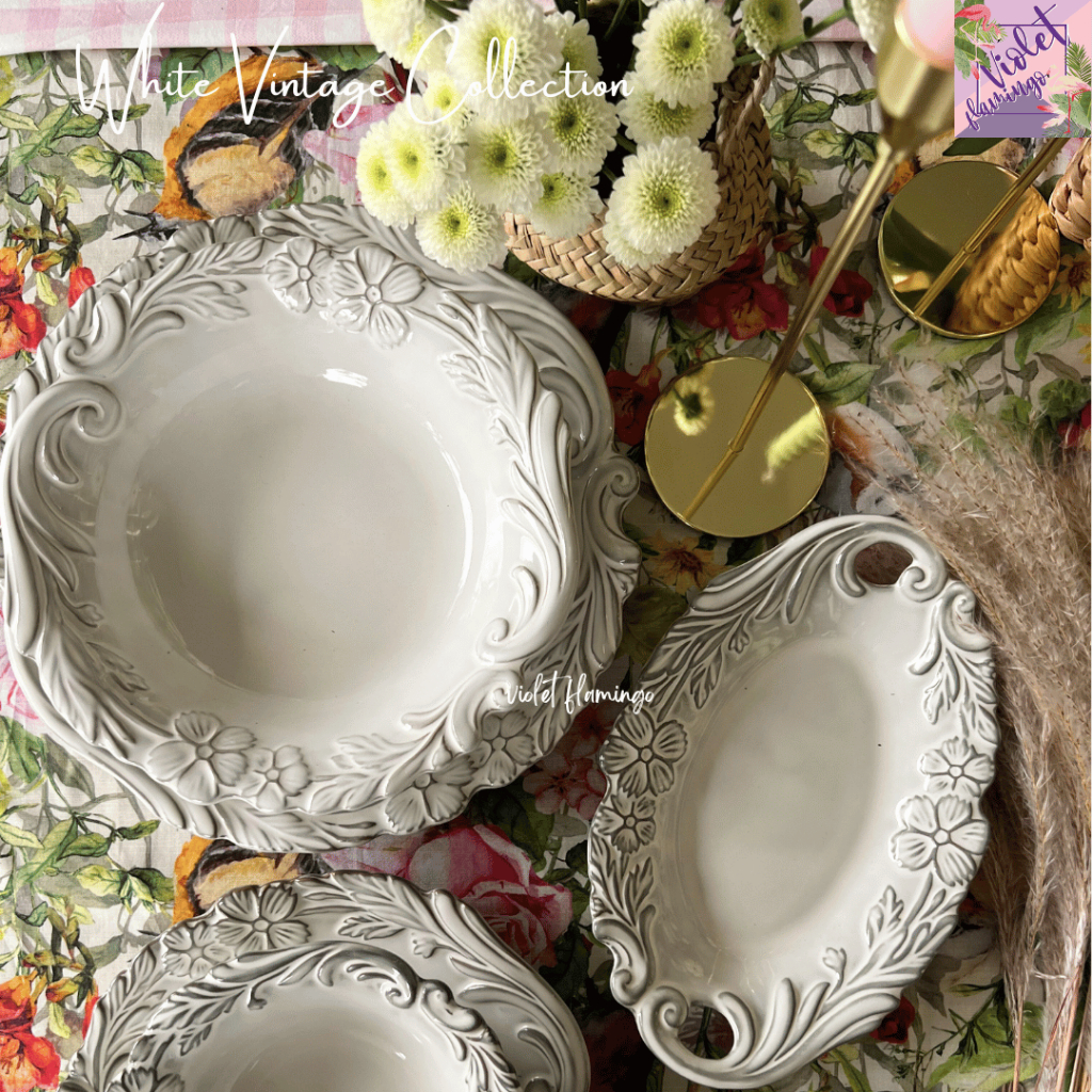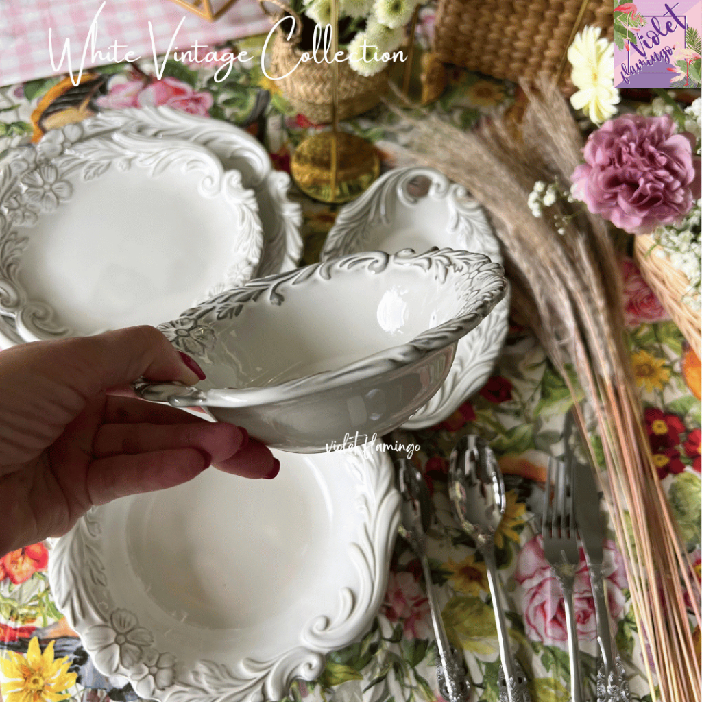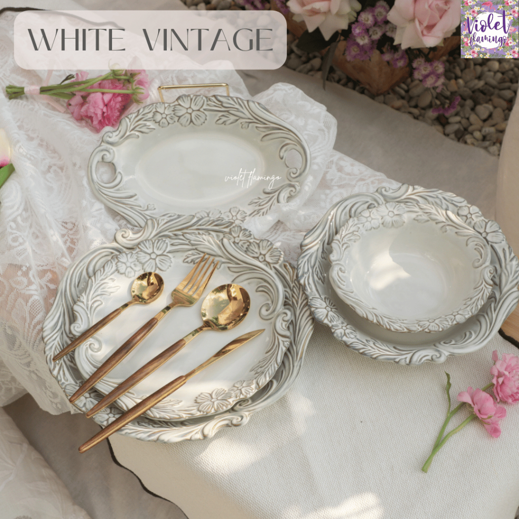 จานสีขาวสไตล์วินเทจ รุ่น Vintage White จานเซรามิคสลักลายดอกไม้รอบจาน จานอาหาร จานขนม จานเปล ถ้วยซุป ถ้วยขนม