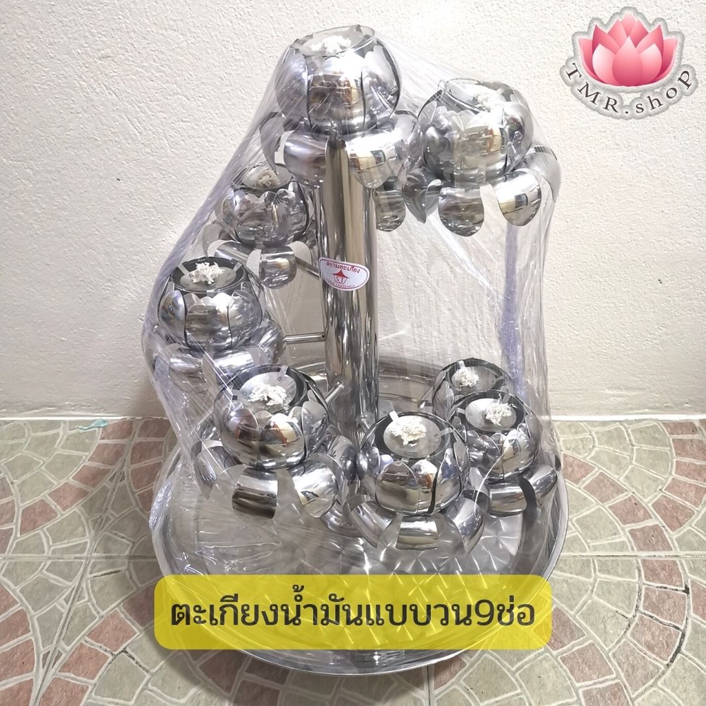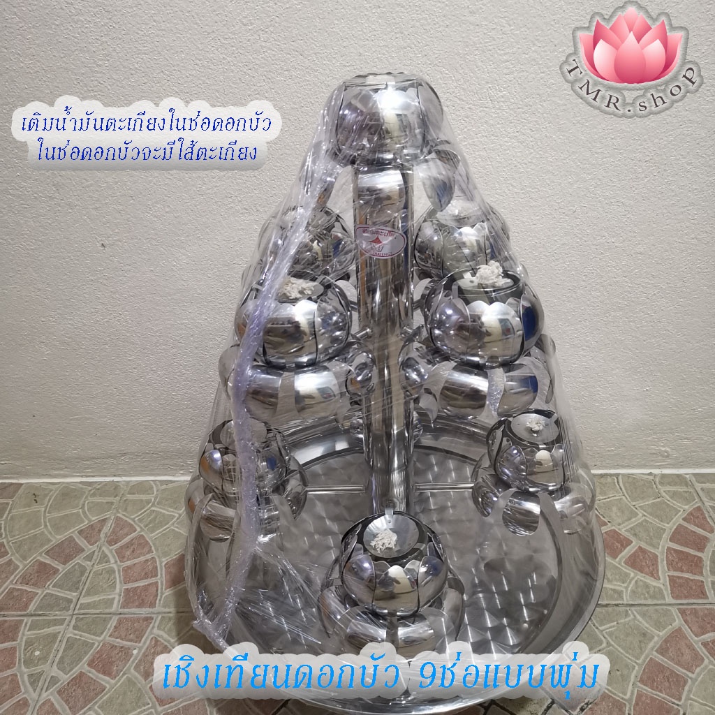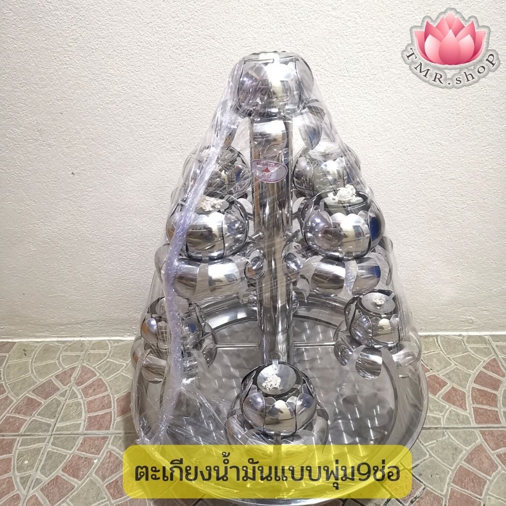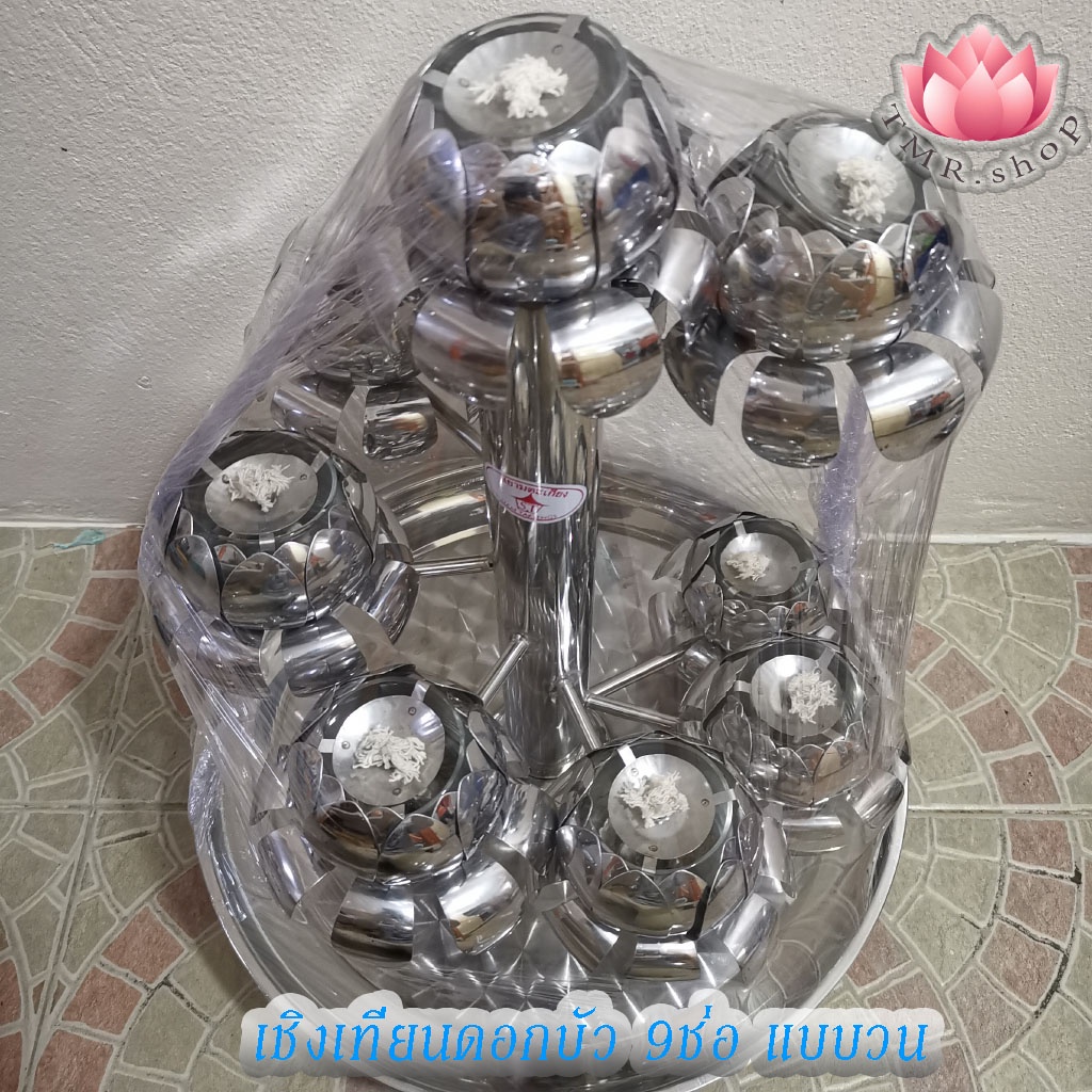 เชิงเทียนสแตนเลสดอกบัว9ช่อ แบบพุ่ม/แบบวน พร้อมถาดรองน้ำมัน