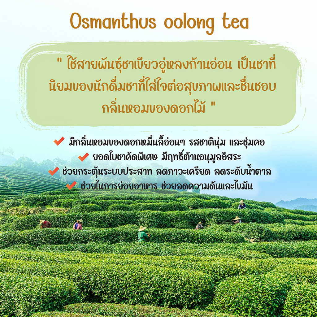 ใช้สายพันธุ์ชาเขียวอู่หลงก้านอ่อน เป็นที่นิยมของนักดื่มชาที่ใส่ใจต่อสุขภาพและชื่นชอบกลิ่นหอมของดอกไม้