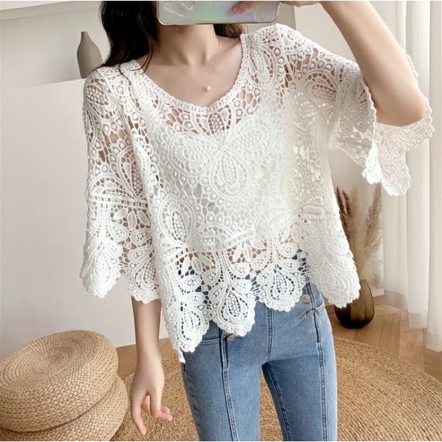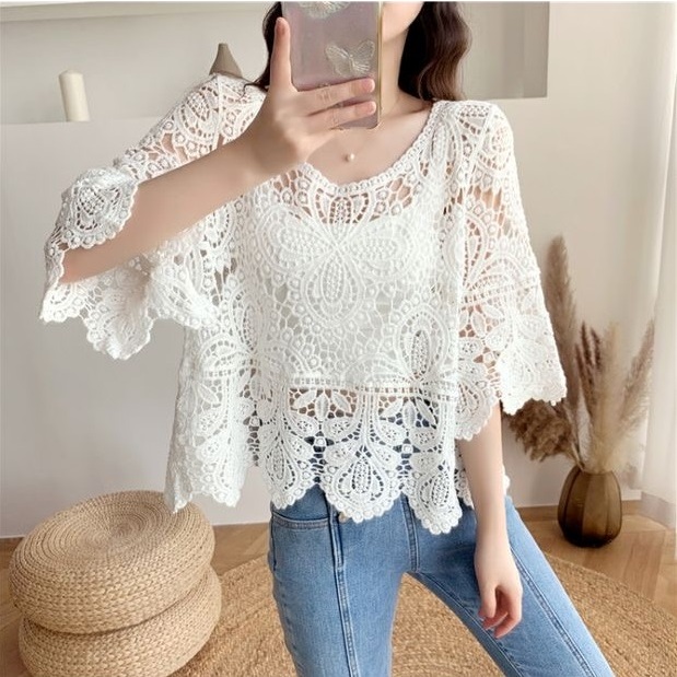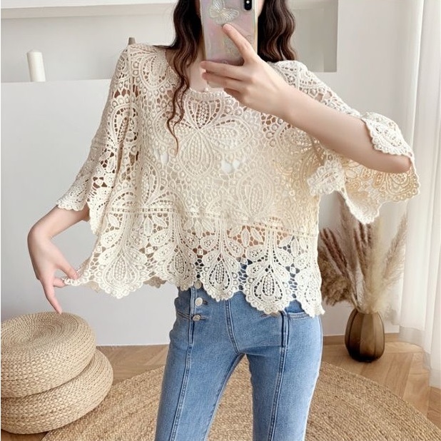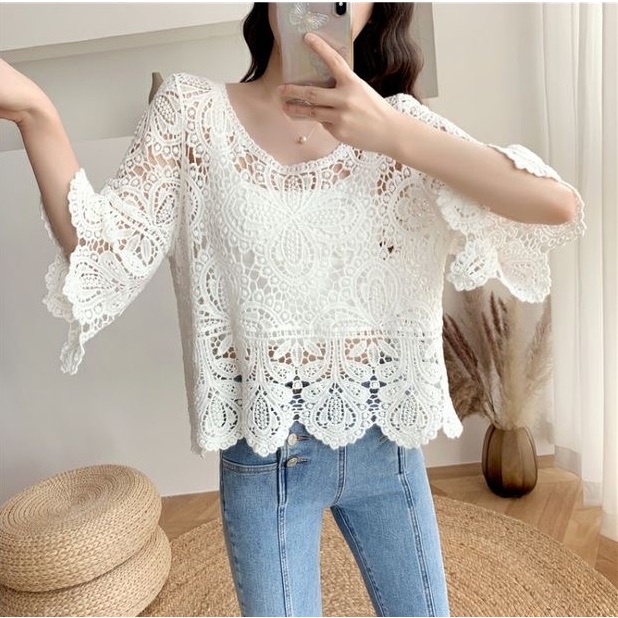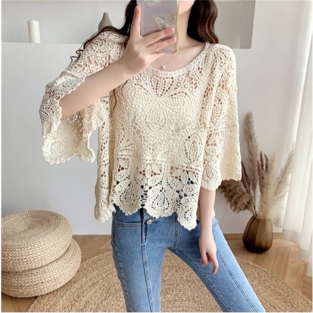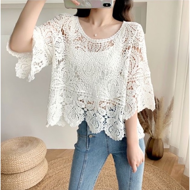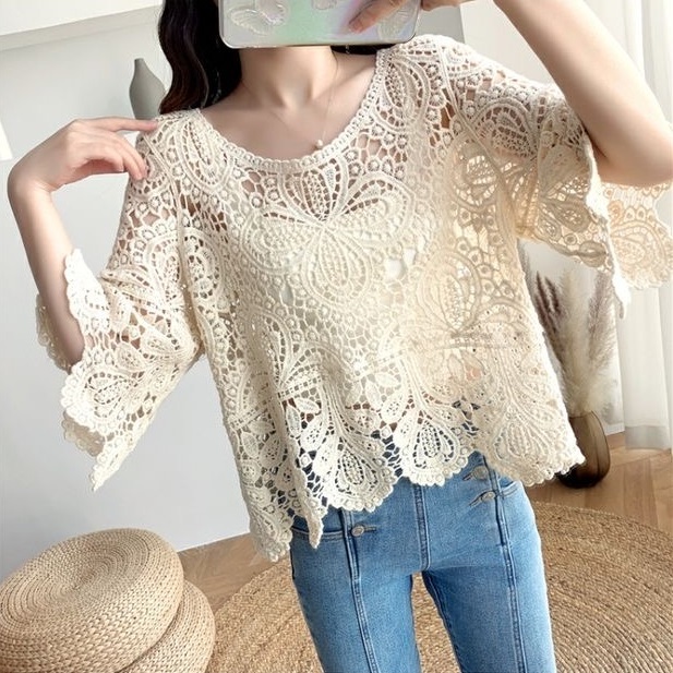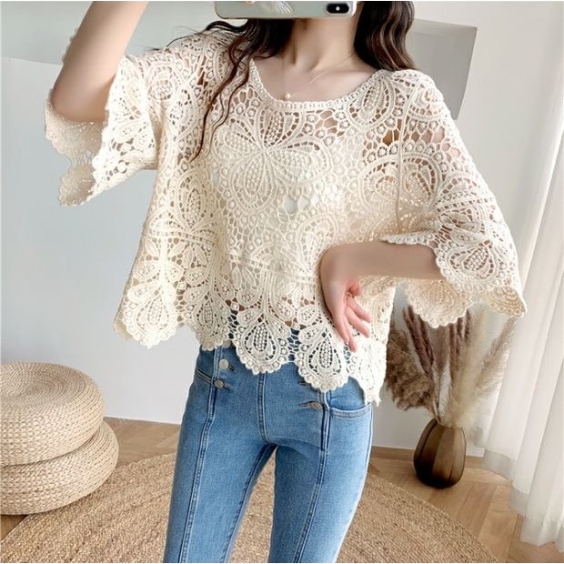 chen เสื้อถักลายฉลุดอกไม้แนววินเทจ แขนกระดิ่ง3ส่วนทรงหลวม สาวไซส์เล็ก-ใหญ่ใส่ได้ ใส่ได้หลายโอกาส