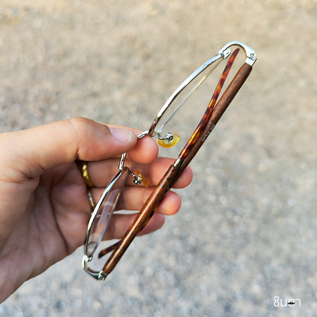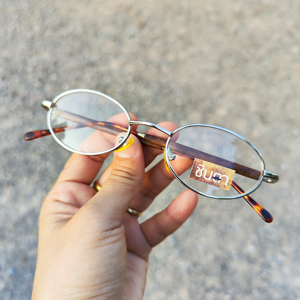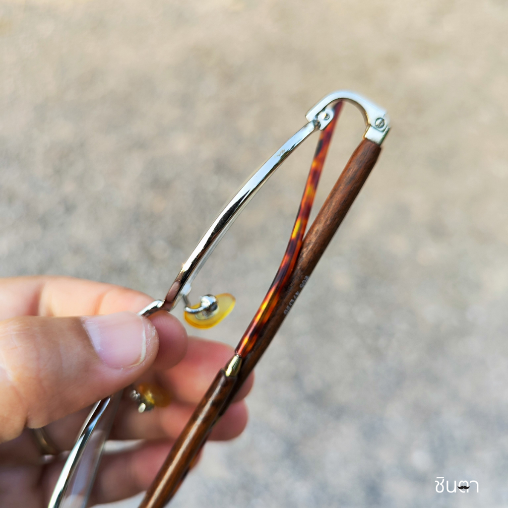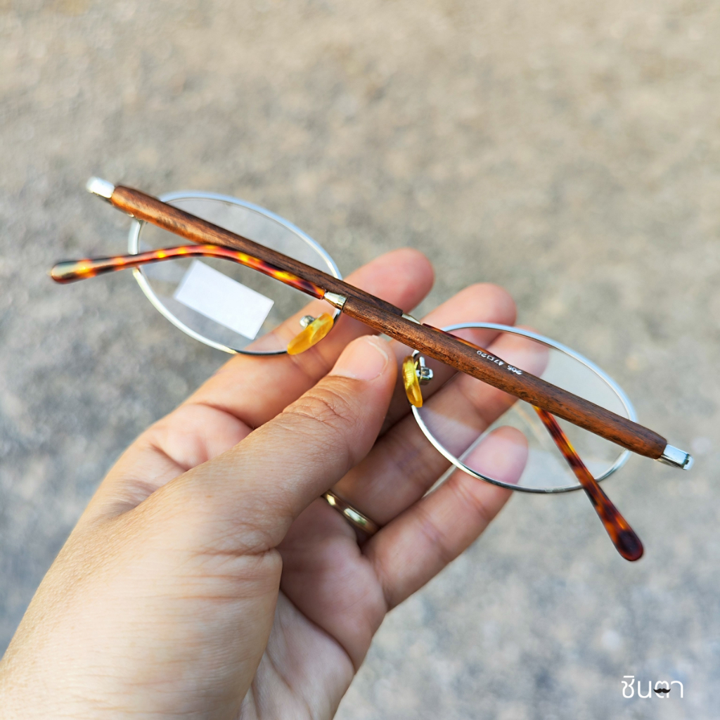 กรอบแว่นตา แว่นตาวินเทจ แว่นเก่าเก็บยุค 90s รุ่น Ree Wood Silver กรอบเล็กทรงรีมน สีเงิน เลนส์ใส ขาหุ้มด้วยไม้ รองรับการนำไปตัดเลนส์สายตา วินเทจแท้ หายากและไม่มีผลิตอีกแล้ว นำเสนอโดย ร้านชินตา