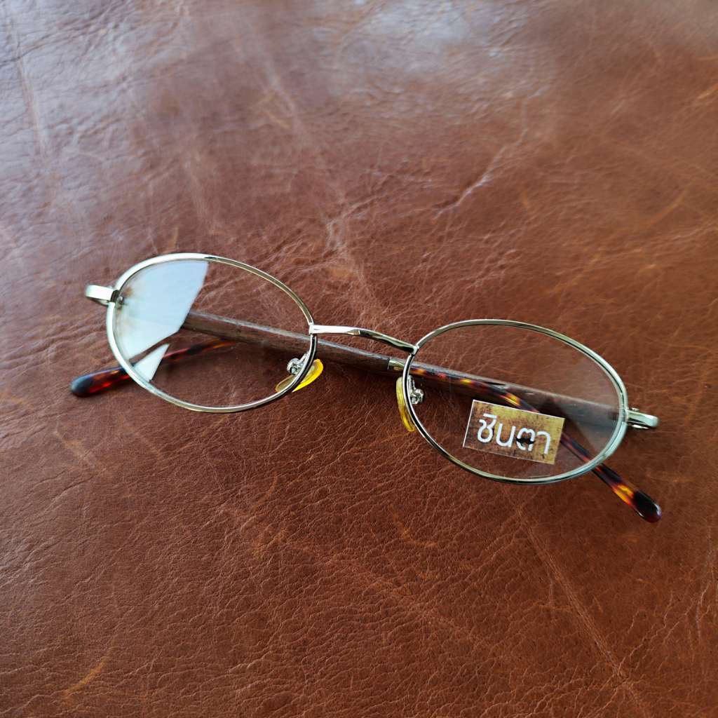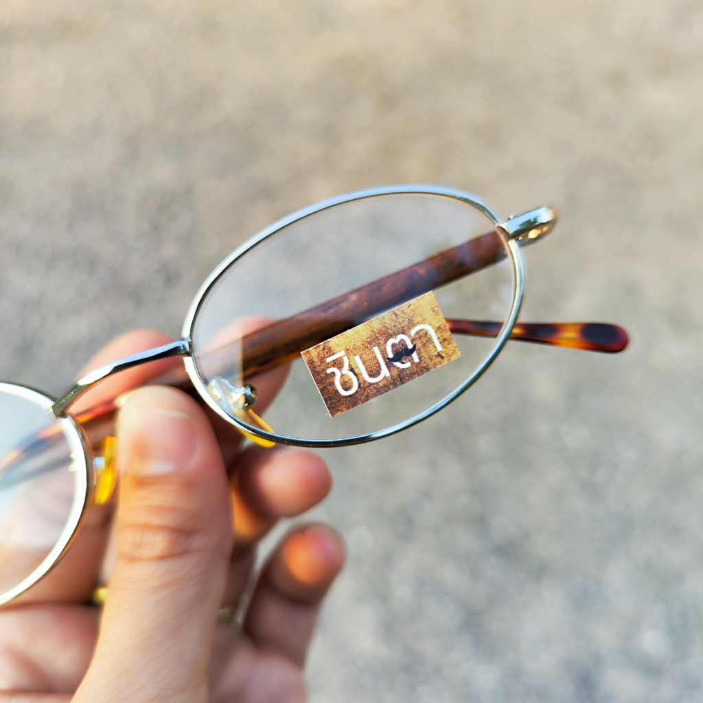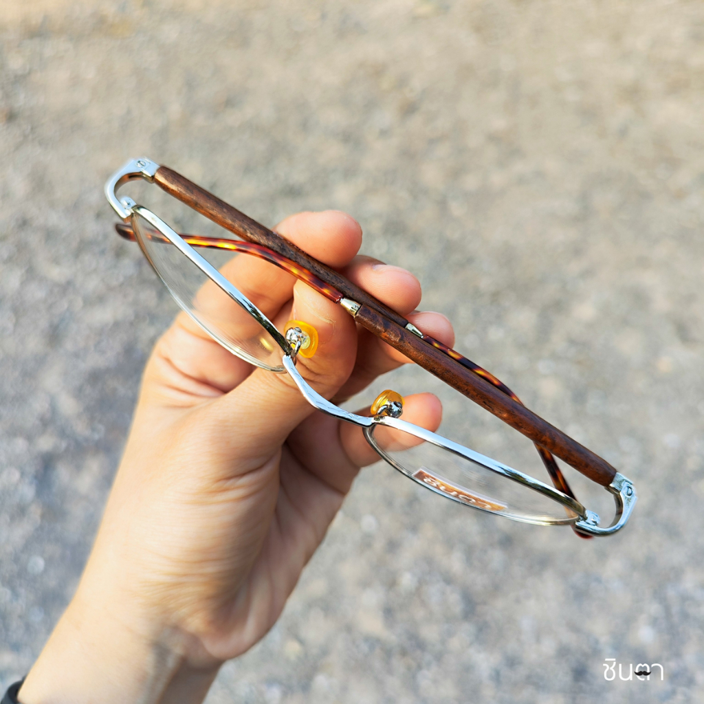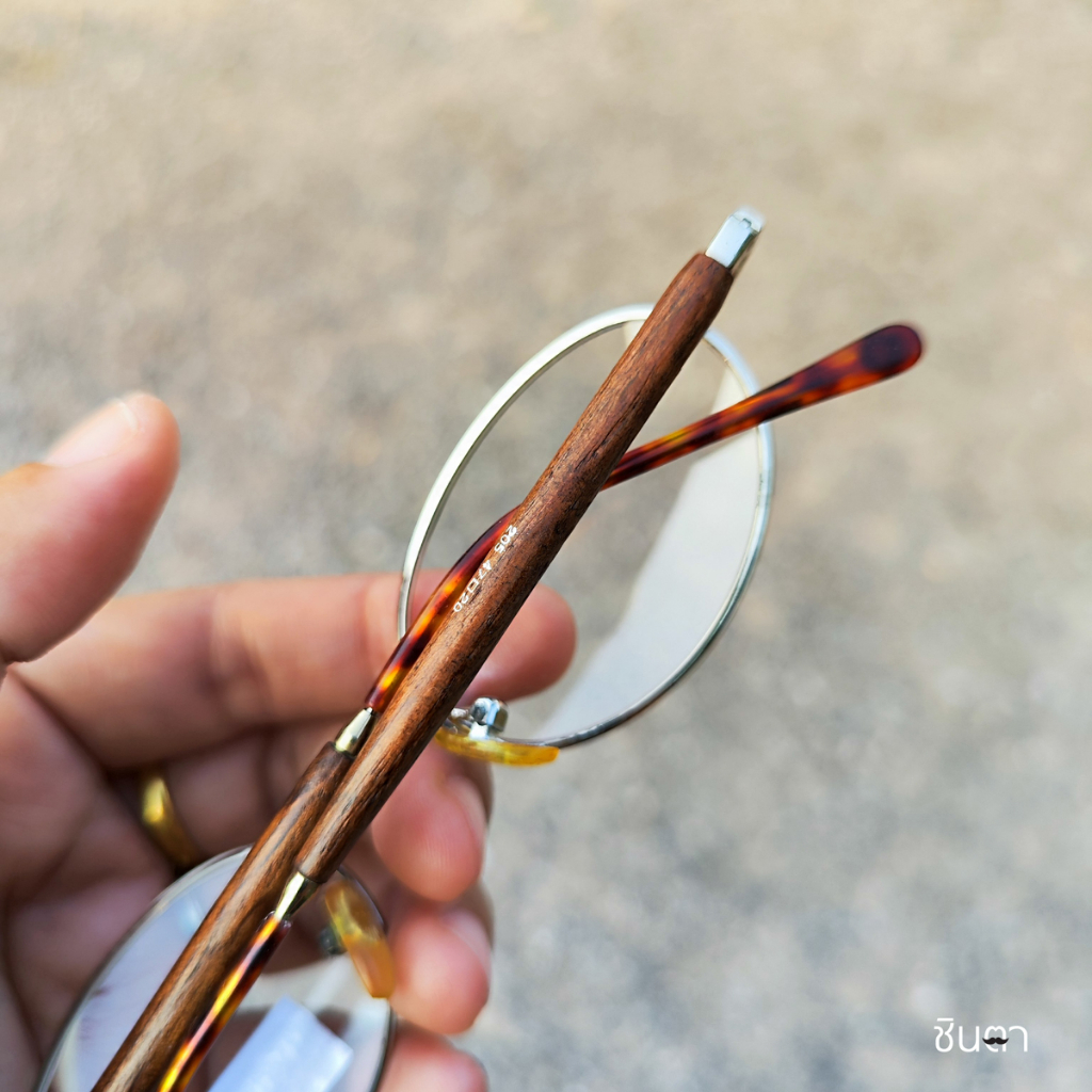 กรอบแว่นตา แว่นตาวินเทจ แว่นเก่าเก็บยุค 90s รุ่น Ree Wood Silver กรอบเล็กทรงรีมน สีเงิน เลนส์ใส ขาหุ้มด้วยไม้ รองรับการนำไปตัดเลนส์สายตา วินเทจแท้ หายากและไม่มีผลิตอีกแล้ว นำเสนอโดย ร้านชินตา