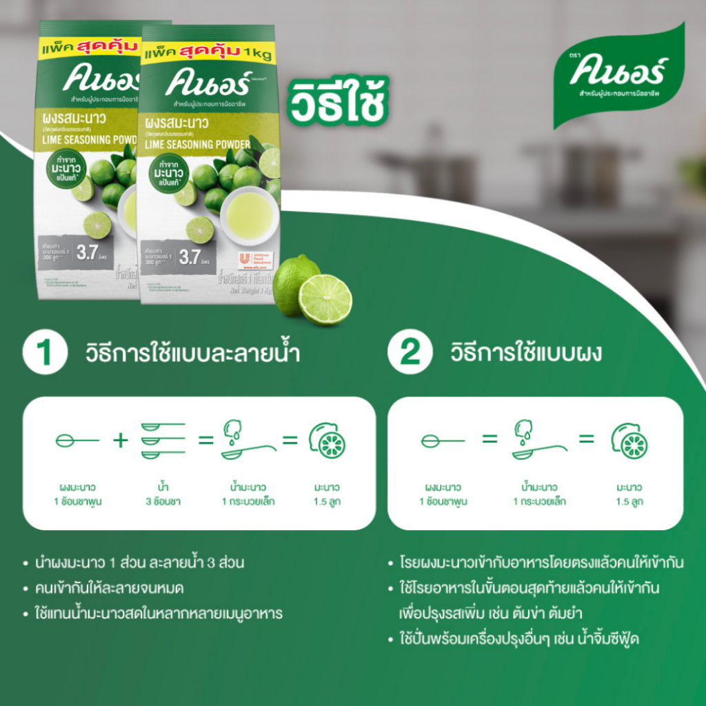 ผงมะนาวพร้อมใช้ ทำจากมะนาวแป้นแท้ ให้รสชาตเปรี้ยวและกลิ่นหอมของมะนาวธรรมชาติ สามารถใช้ในการปรุงอาหารและเครื่องดื่ม ใช้แทนมะนาวสดได้ 100% พียงผสมผงรสมะนาวตราคนอร์กับน้ำเปล่า สามารถใช้ได้กับหลากหลายเมนู ทั้งจานผัด น้ำซุป ต้มยำ น้ำจิ้ม รวมไปถึงเครื่องดื่ม (ส