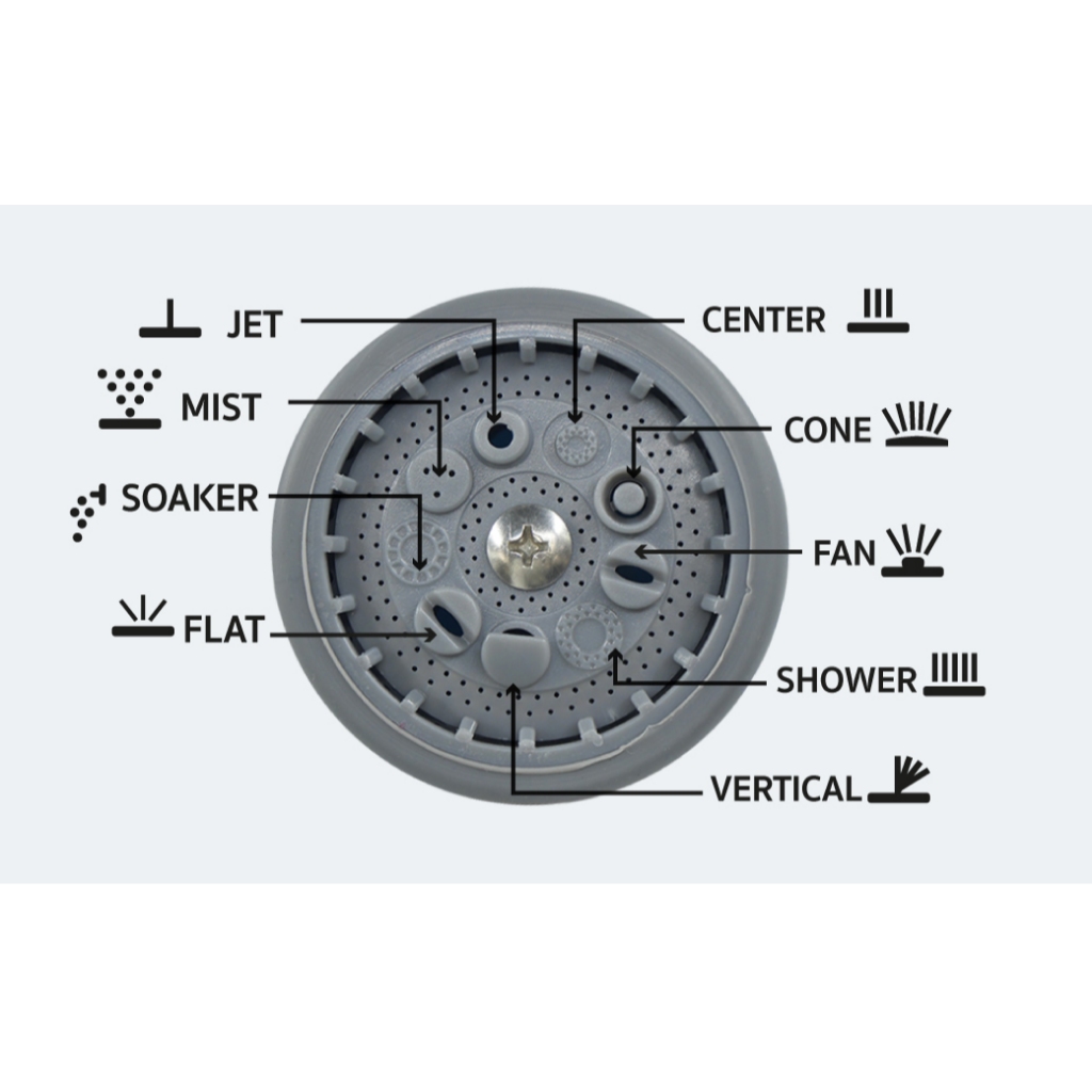 -สามารถปรับเปลี่ยนรูปแบบของน้ำได้ 9 รูปแบบ เพียงมือหมุนที่หัวฉีด (MIST, SOAKER, FLAT, VERTICAL, SHOWER, FAN, CONE, CENTER, SET)