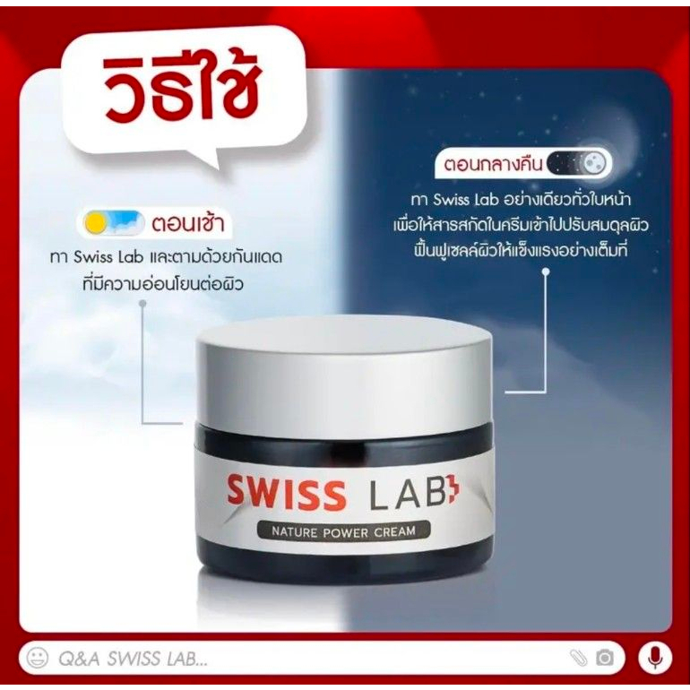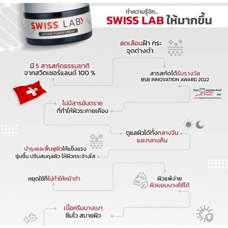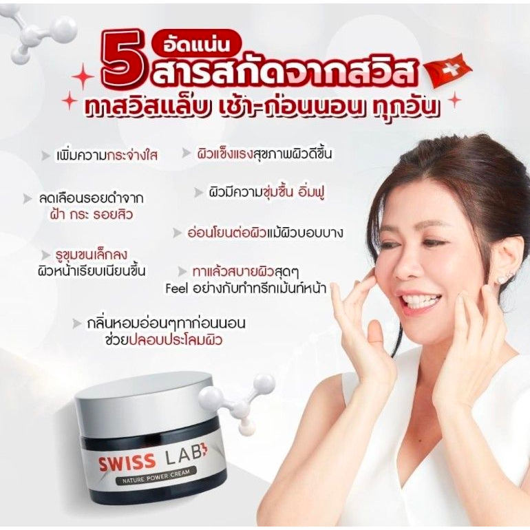 Swiss Lab ครีมบำรุงผิวที่ช่วยฟื้นฟูผิวให้เปล่งปลั่ง ลดเลือนรอยดำจากฝ้า กระ จุดด่างดำ และต่อต้านริ้วรอยแห่งวัย ด้วยประสิทธิภาพจาก สารสกัด MossCellTech™ หรือมอส จะช่วยรักษานิวเคลียสของเซลล์ผิวให้คงสภาพดี มีความยืดหยุ่น ผิวจึงแลดูอ่อนเยาว์ แข็งแรง
