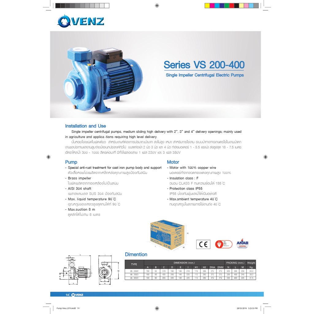 VENZ ปั๊มหอยโข่งไฟฟ้า 2 HP 2 นิ้ว x 2 นิ้ว รุ่น VS200/2T ไฟ 380V ใบพัดทองเหลือง ขดลวดทองแดงแท้ รับประกันศูนย์