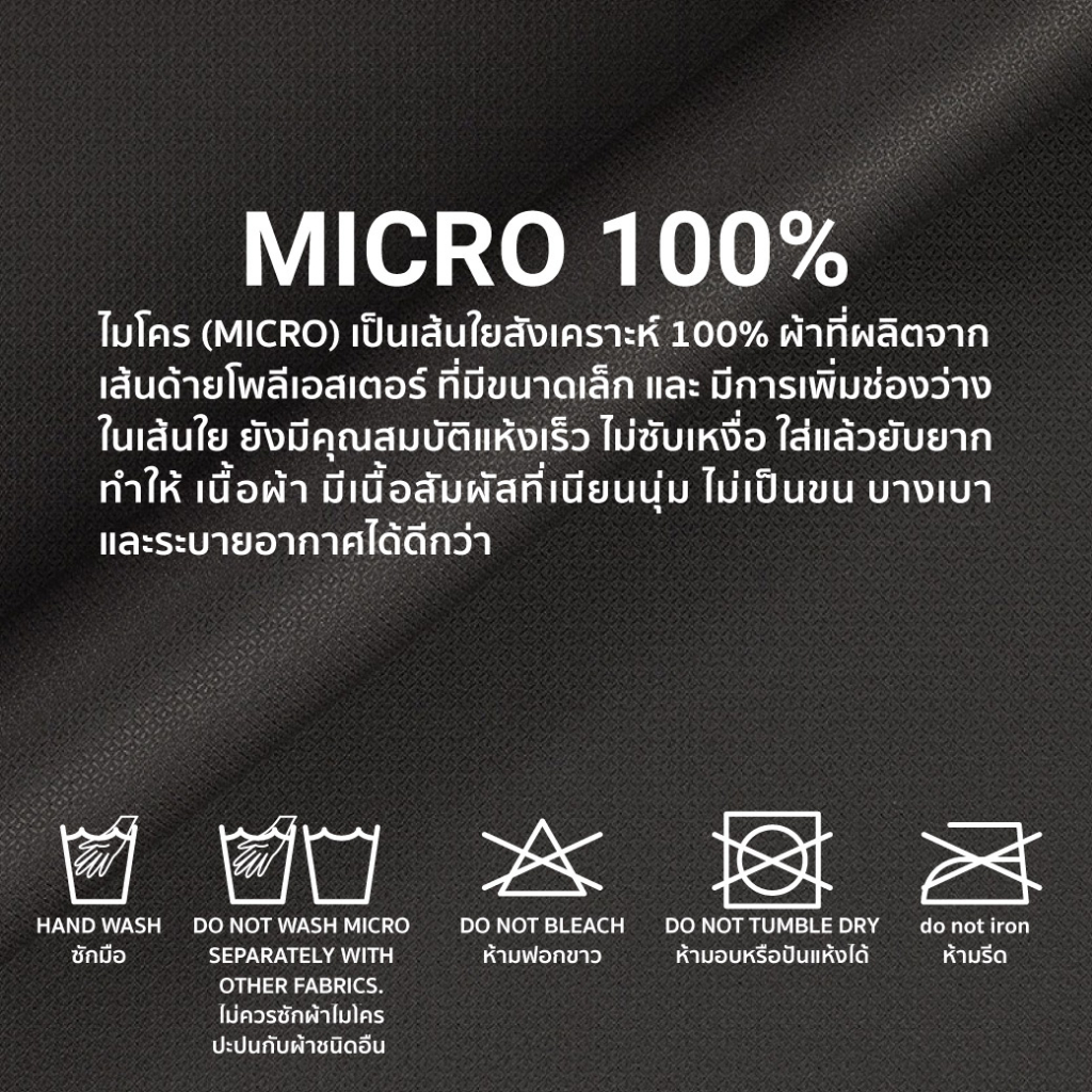 เนื้อผ้า Micro Filament(ไมโครฟิลาเมนท์) เส้นด้ายขนาดเล็กระดับ Micro Filament ช่วยซึมซับเหงื่อและระบายออกได้ในทันที จึงทำให้เนื้อผ้าโปร่ง เบาสบาย แห้งไว ระบายเหงื่อได