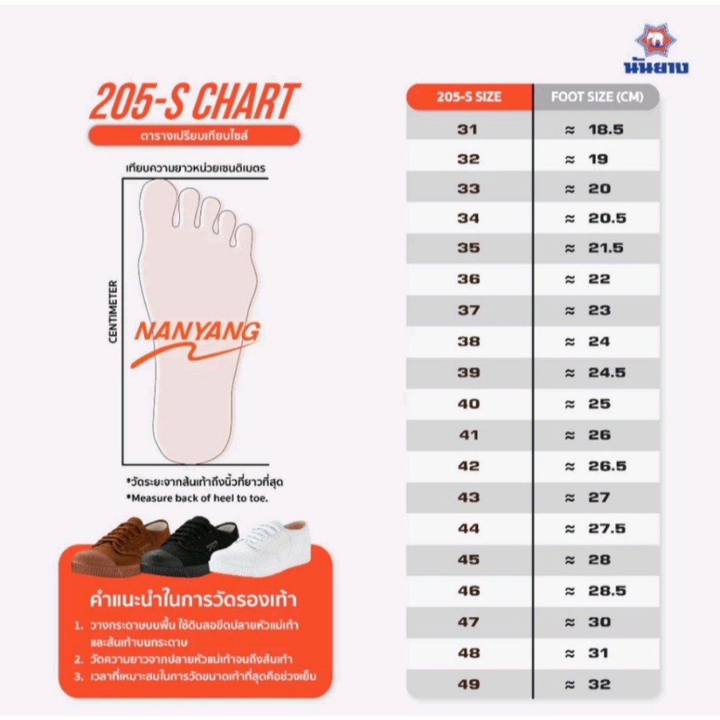 Nanyang รองเท้าผ้าใบ รองเท้านักเรียนนันยาง รุ่น 205-S สีขาว น้ำตาล ดำ (White) (Brown) (Black) ไซส์ 30-45 พร้อมส่ง