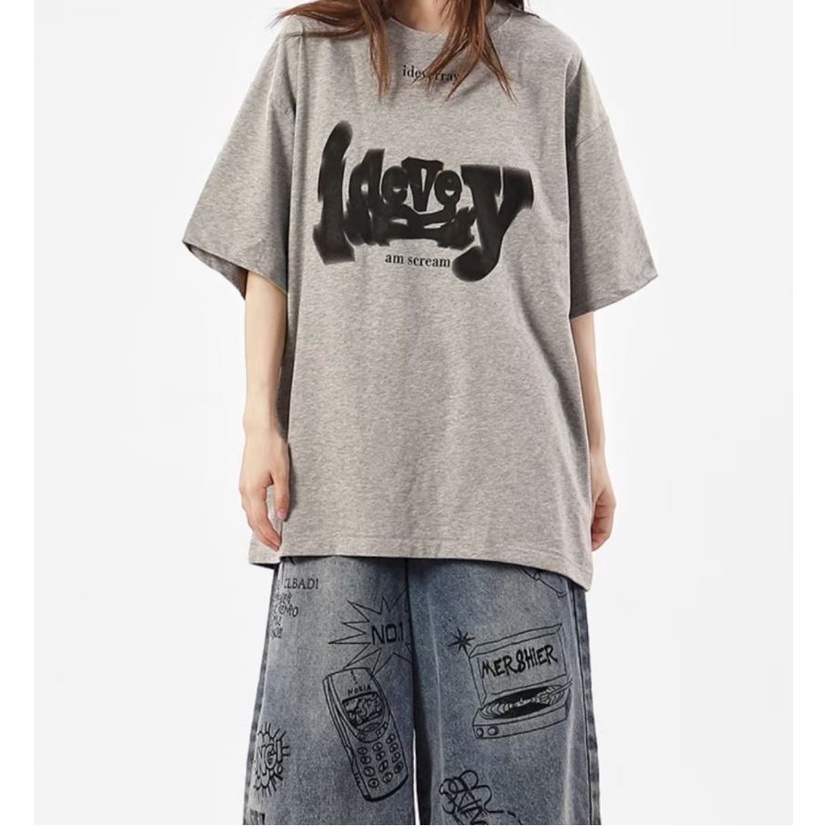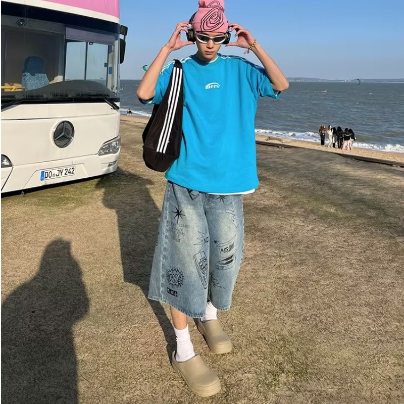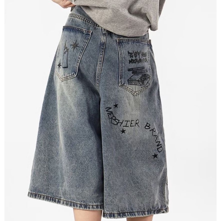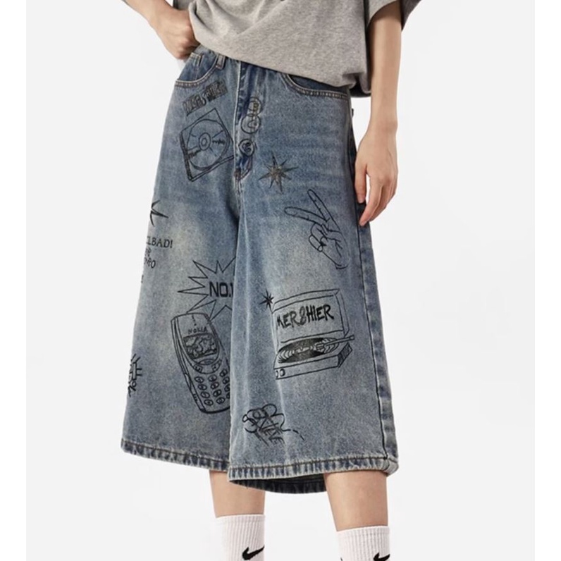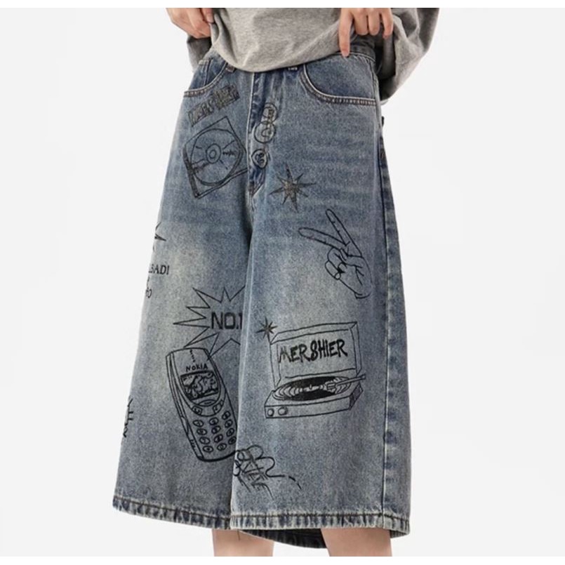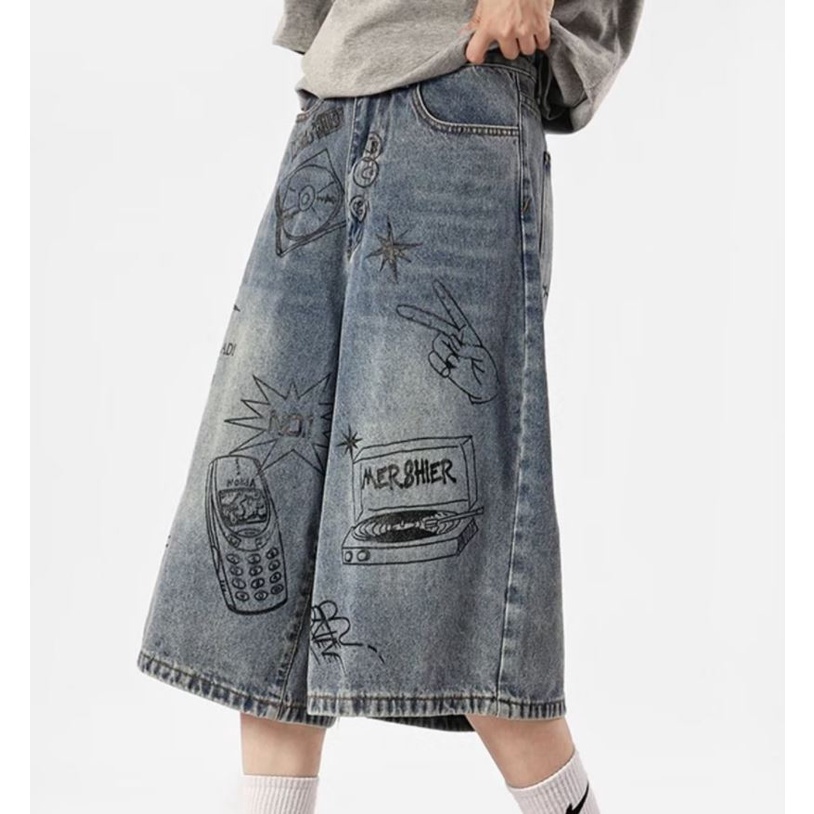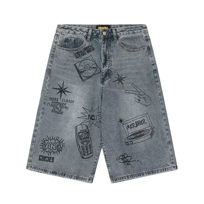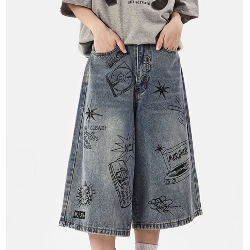 กางเกงยีนขาสั้น ขากว้าง ทรงหลวม พิมพ์ลายกราฟฟิติ แบบสร้างสรรค์ แฟชั่นฤดูร้อน สไตล์อเมริกันเรโทร สําหรับผู้ชาย