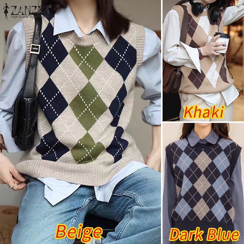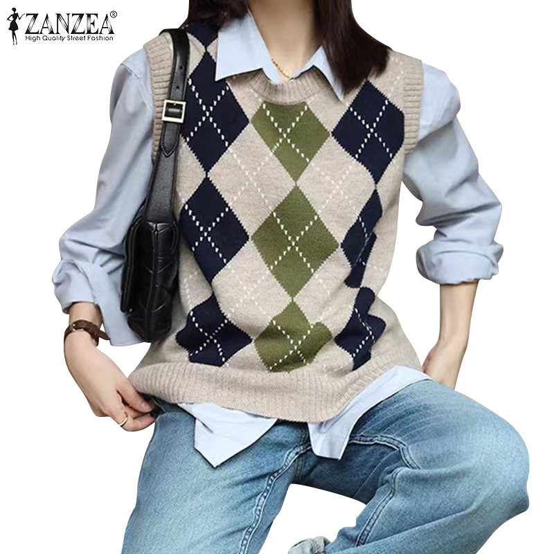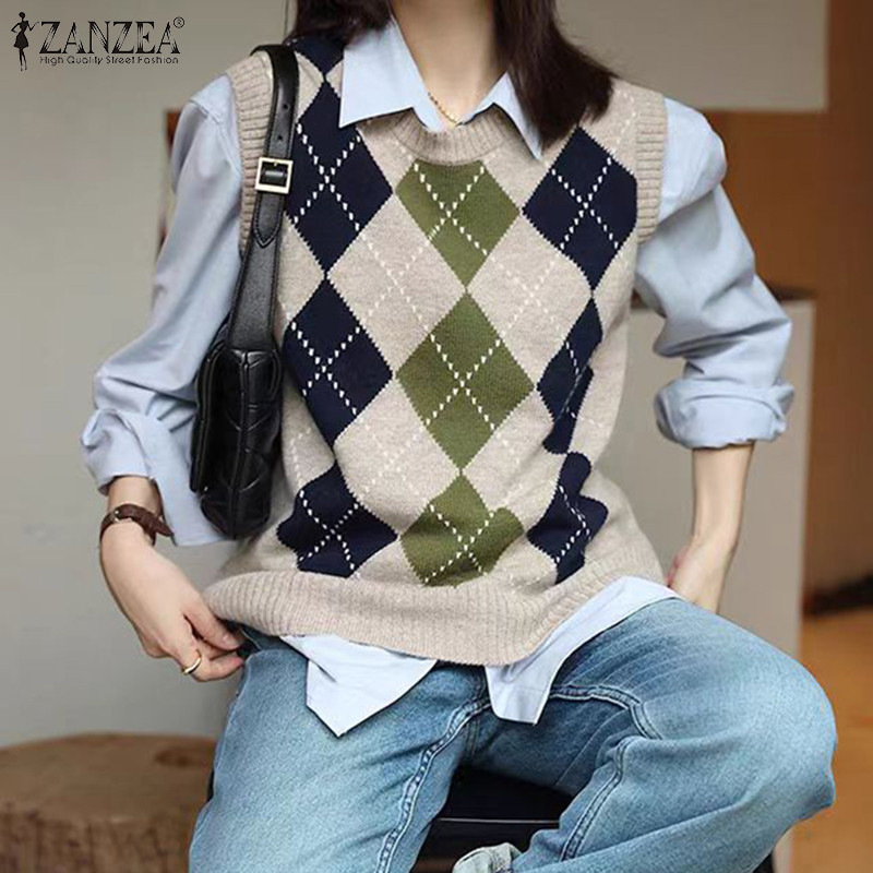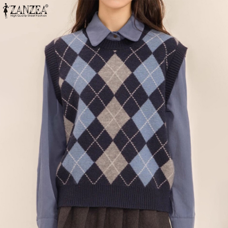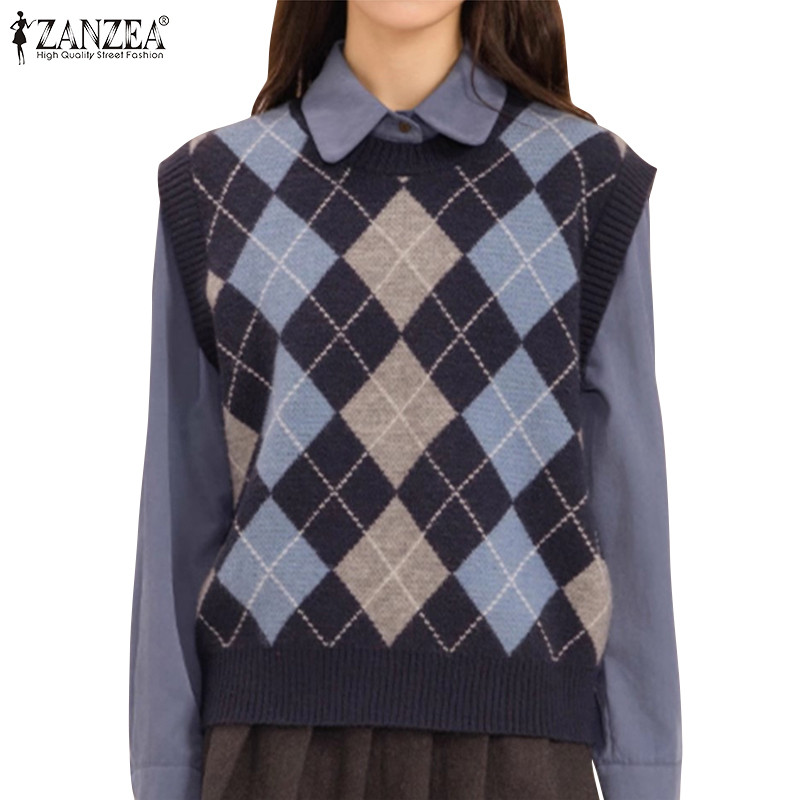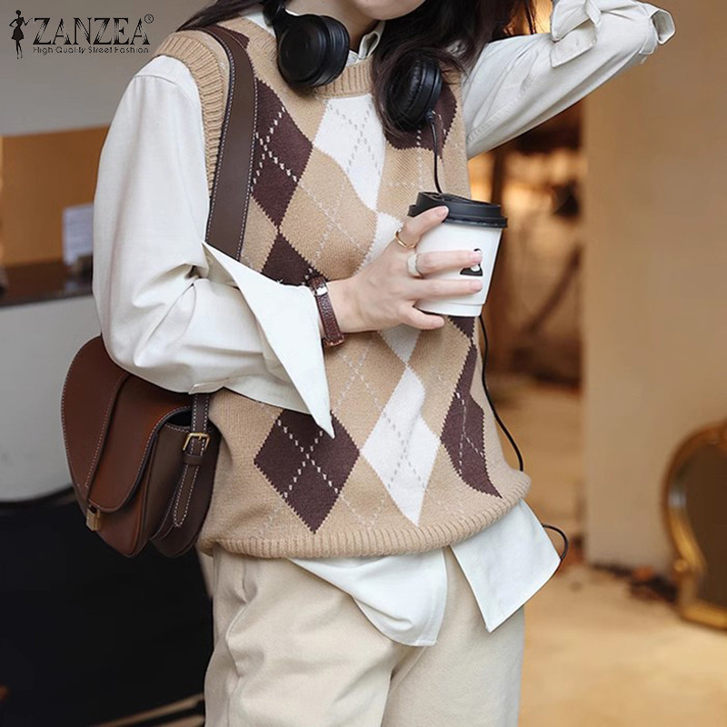 ZANZEA ใส่ ซานเซีย ผู้หญิงเกาหลีสบายๆที่เรียบง่ายรอบคอลายสก๊อตแขนกุดทุกวันเสื้อกั๊ก