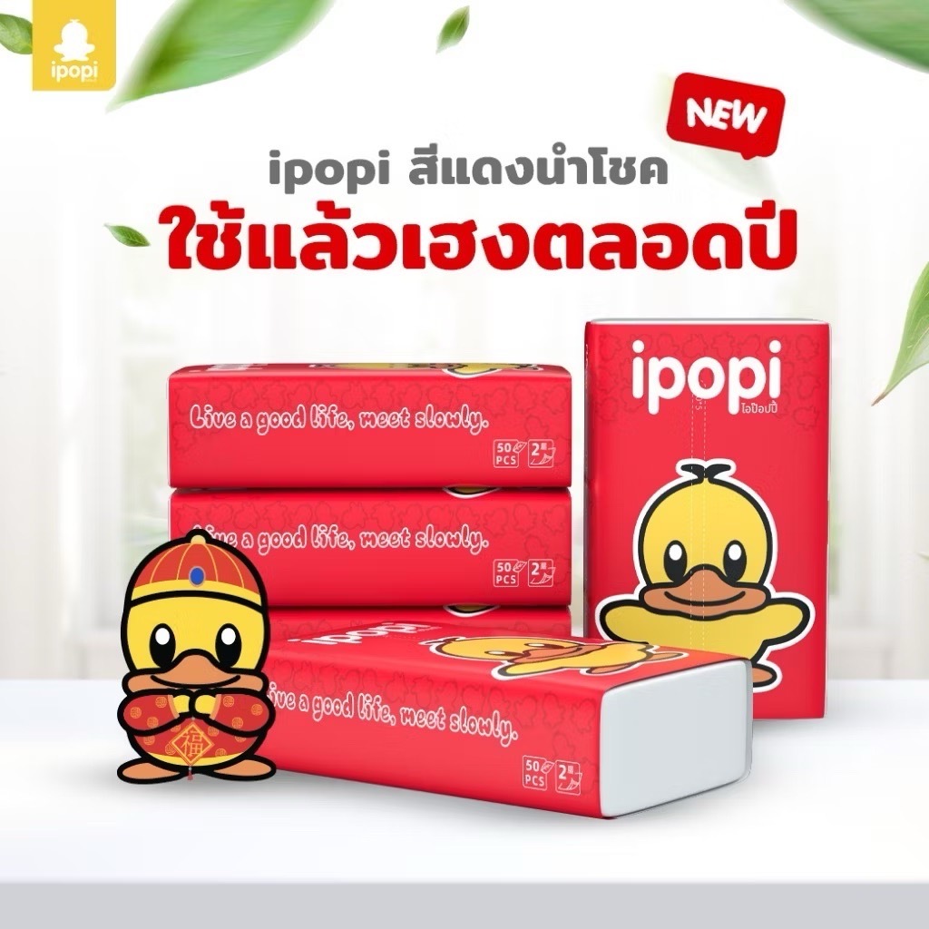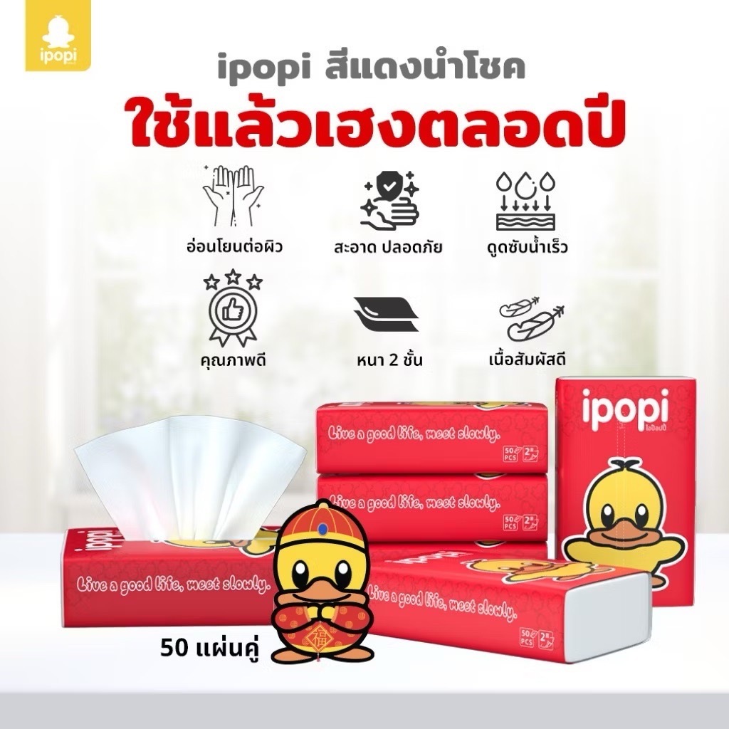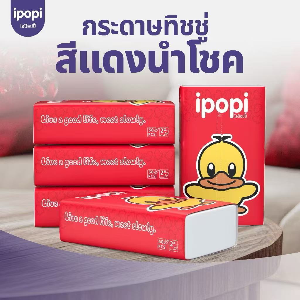 ipopi กระดาษทิชชู่แบบดึง ห่อสีแดง 25 ห่อ (50 แผ่น/ห่อ ) หนา 2 ชั้น ได้รับมาตรฐาน ขนาดพกพา