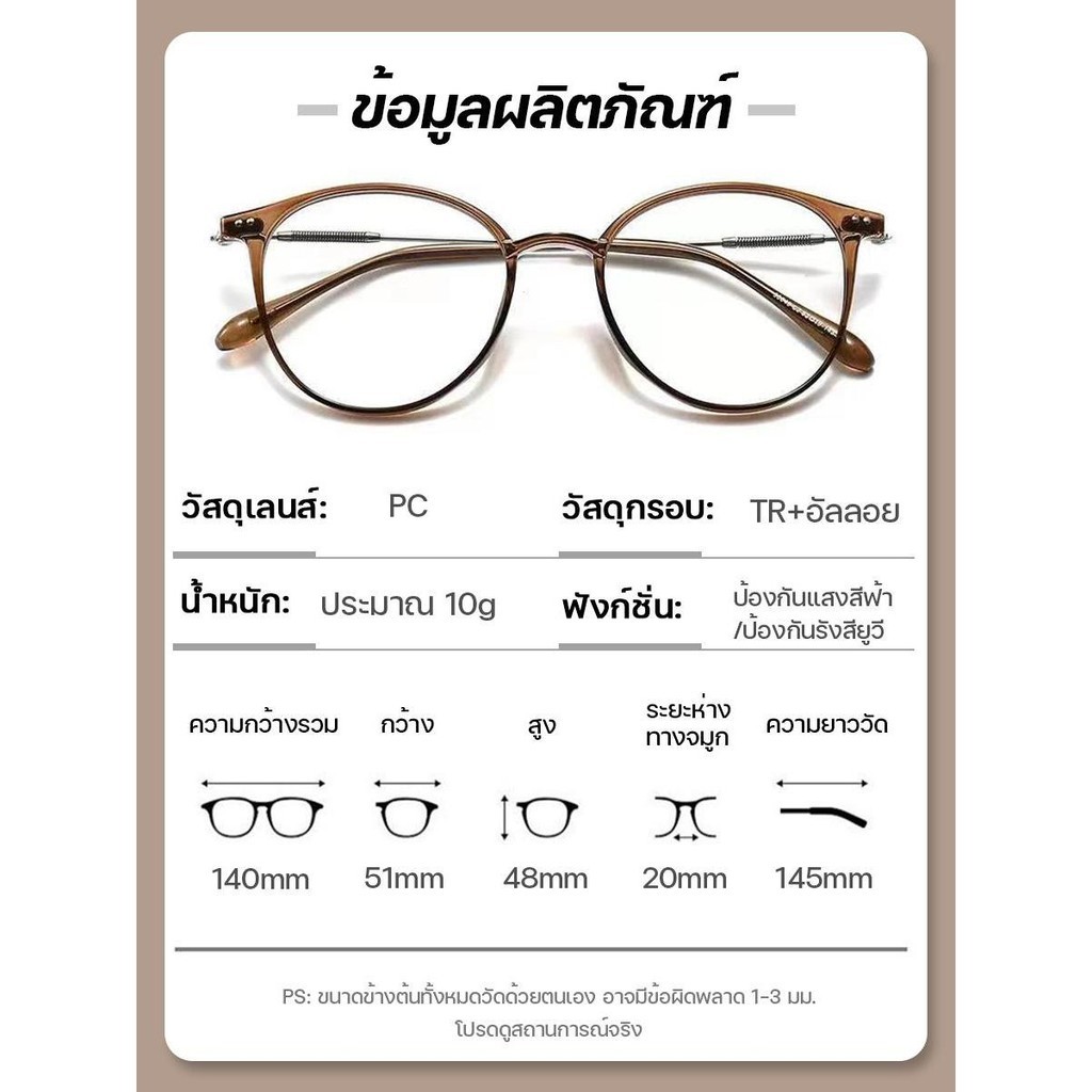 | Model | สีชา, 0°(การมองเห็นปกติ ), สีชา, -0.50(สายตาสั้น), สีชา, -1.00(สายตาสั้น), สีชา, -1.50(สายตาสั้น), สีชา, -2.00(สายตาสั้น), สีชา, -2.50(สายตาสั้น), สีชา, -3.00(สายตาสั้น), สีชา, -3.50(สายตาสั้น), สีชา, -4.00(สายตาสั้น), สีชา, +0.50(สายตายาว), สีชา, +1.00(สายตายาว), สีชา, +1.50(ส |
