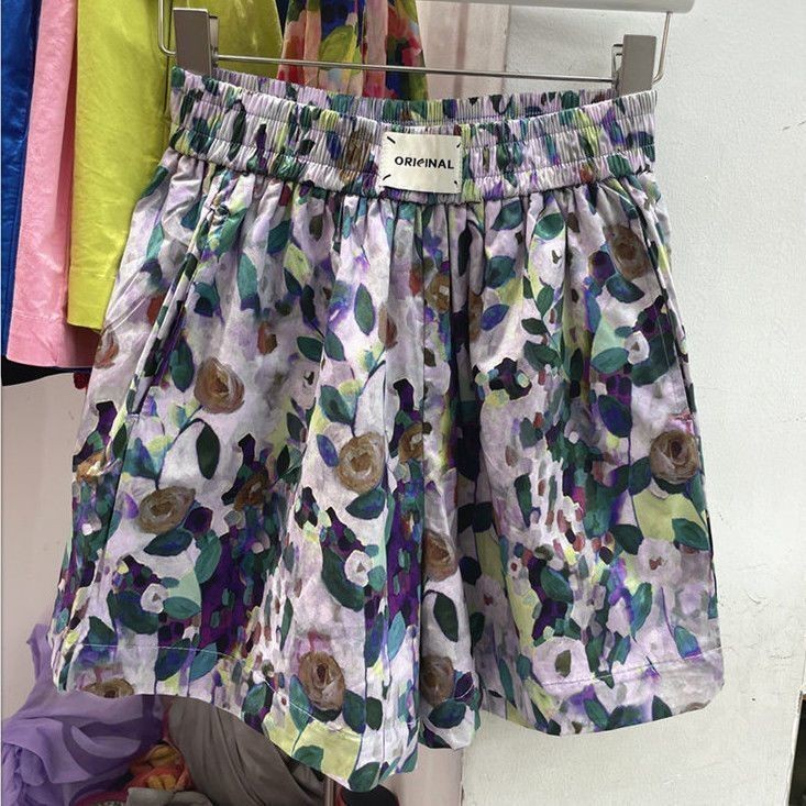 2024 หลวมที่มีสีสันดอกไม้กางเกงขาสั้นผู้หญิงรุ่นเอวสูงสบายๆอเนกประสงค์กางเกงขากว้างผู้หญิง2024宽松彩色碎花休闲裤女版高短裤女百搭女♣5.16