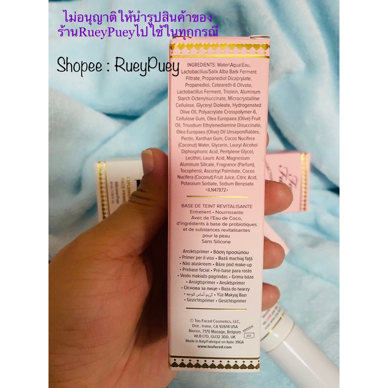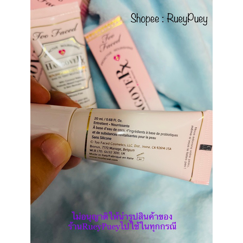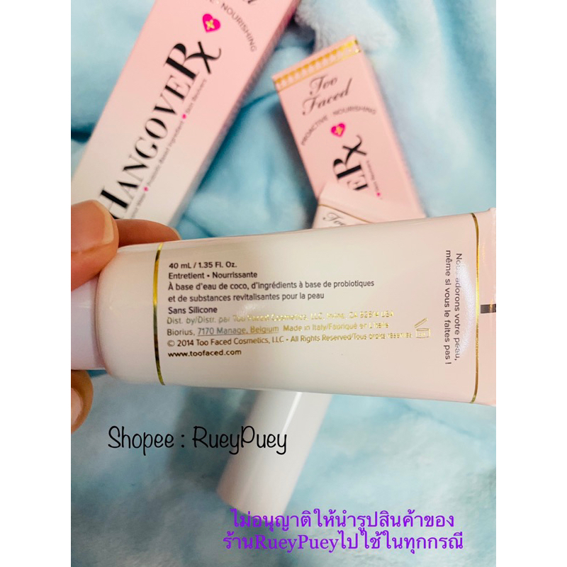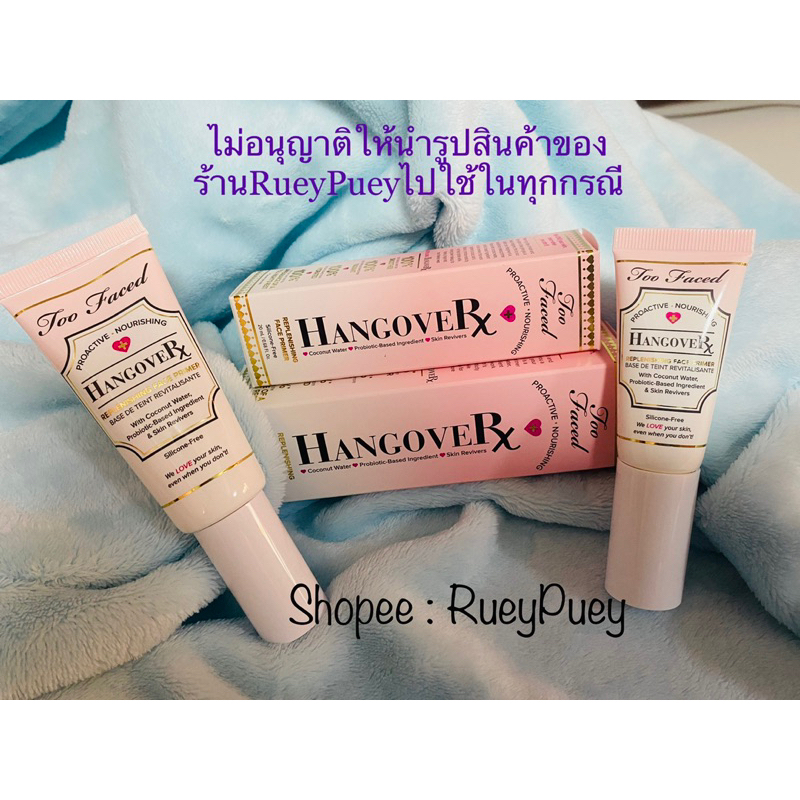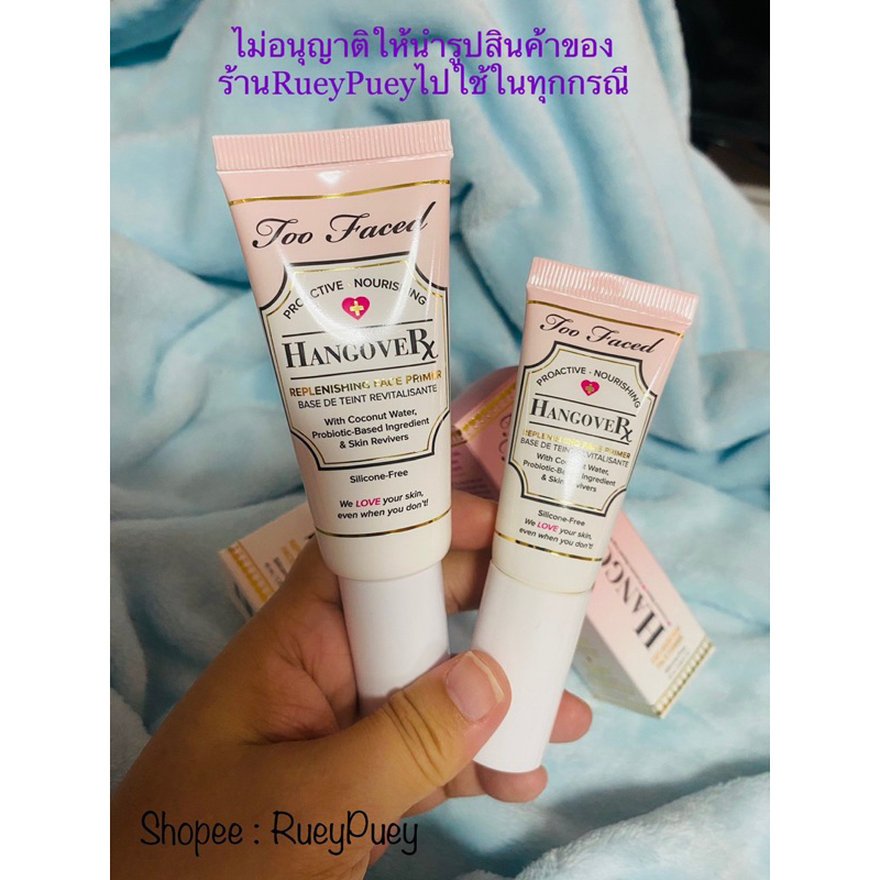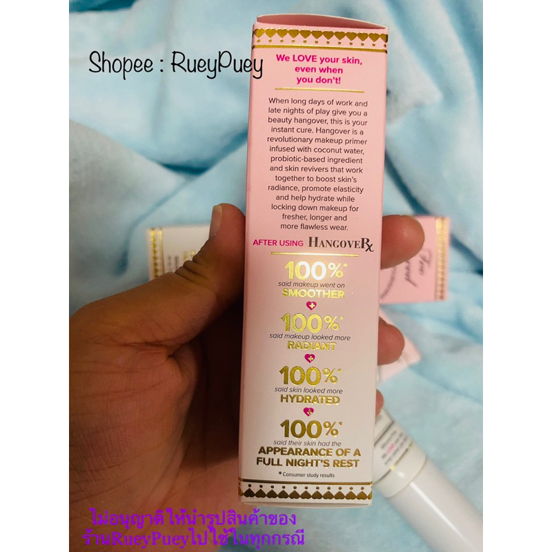 ไพรเมอร์ Hangove RX Replenishing Face Primer ยี่ห้อ Too Faced ส่วนผสมของน้ำมะพร้าว และโปรไบโอติก สามารถฟื้นฟู คืนความชุ่มชื้น และปรับผิวหน้าให้เรียบเนียมสดใส ทำให้เครื่องสำอางค์ติดทนนาน