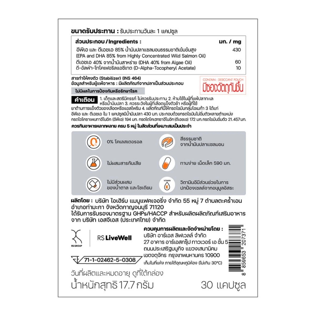 อีพีเอ และ ดีเอชเอ 85% น้ำมันปลาแซลมอนธรรมชาติเข้มข้นสูง 430 มก. /mg