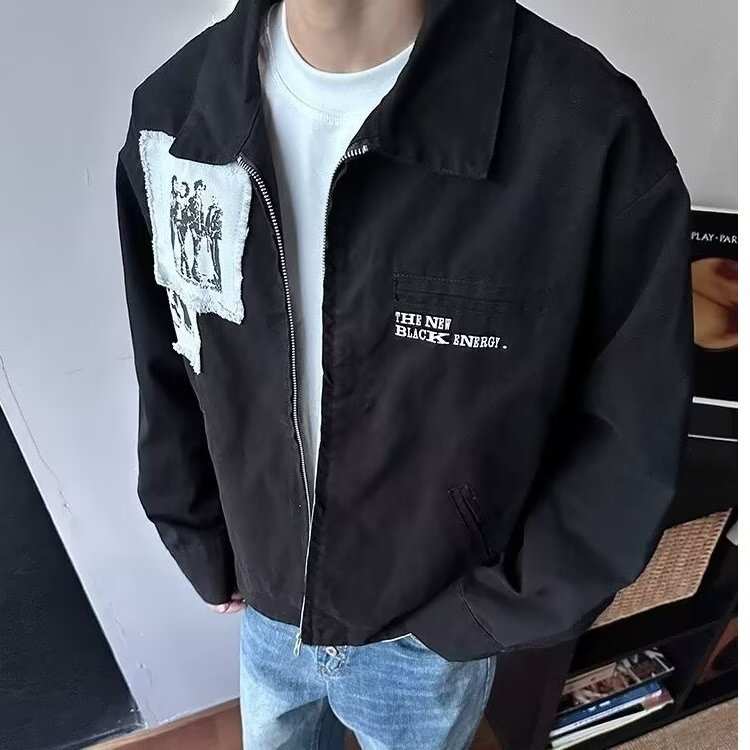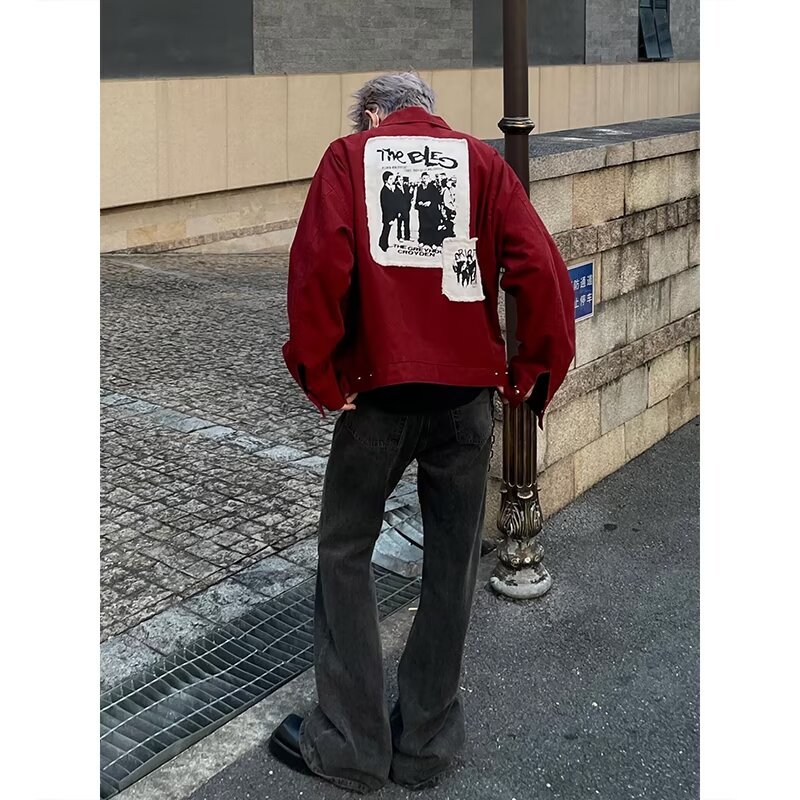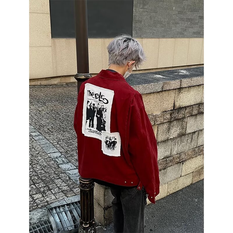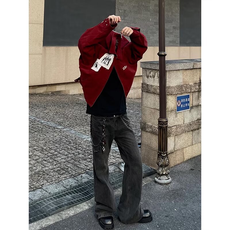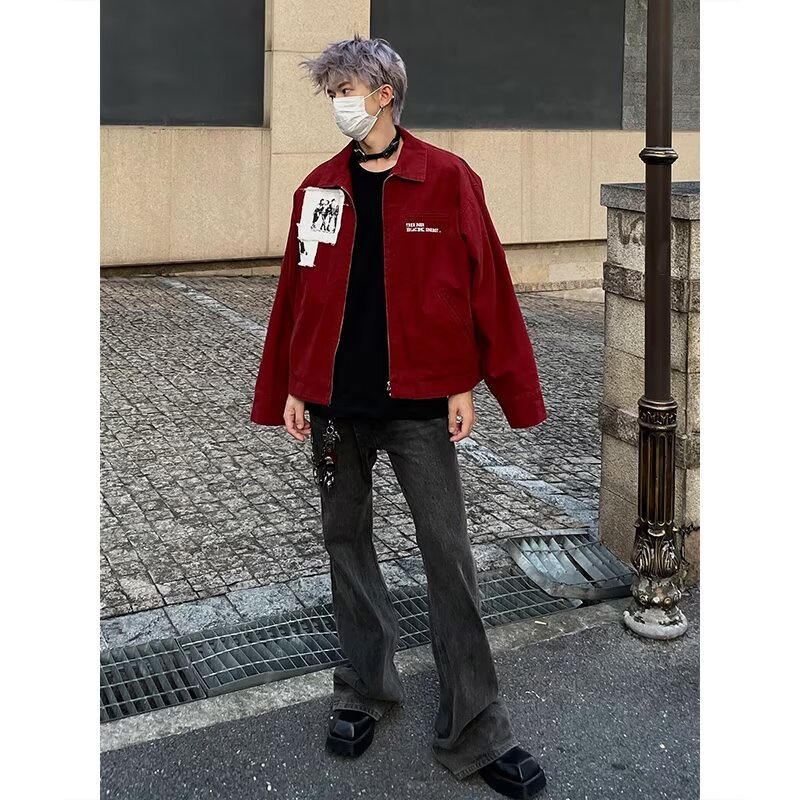ฤดูใบไม้ร่วง Casual All-Match เสื้อผู้ชายสีดําสีแดง M-2XL อเมริกันย้อนยุค cleanfit ความรู้สึกระดับไฮเอนด์ Ruffian หล่อสั้น Detroit แจ็คเก็ตผู้ชาย
