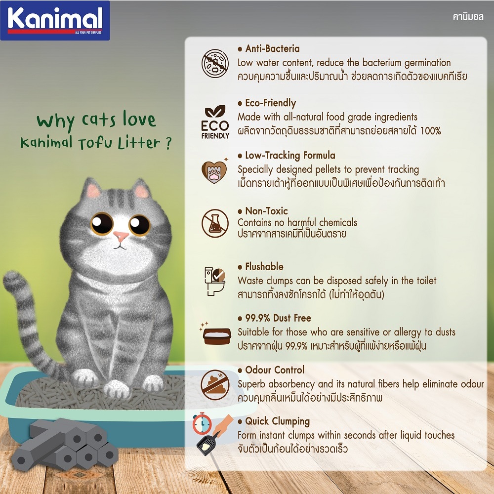 Kanimal Natural Tofu Litter คัดสรรทรายแมวจากถั่วลันเตาธรรมชาติ เพื่อให้น้องแมวเข้าห้องน้ำอย่างมีความสุข จับตัวเป็นก้อนเร็ว เก็บกลิ่น ไร้ฝุ่น ผลิตจากธรรมชาติ ใช้ถั่วลันเตาเป็นส่วนผสมหลักทำให้ปราศจากฝุ่น เชื้อรา และไม่เหม็นเปรี้ยว สามารถทิ้งลงชักโครกได้