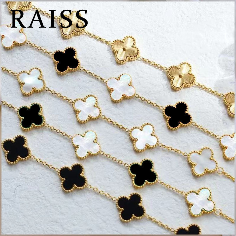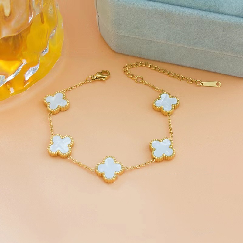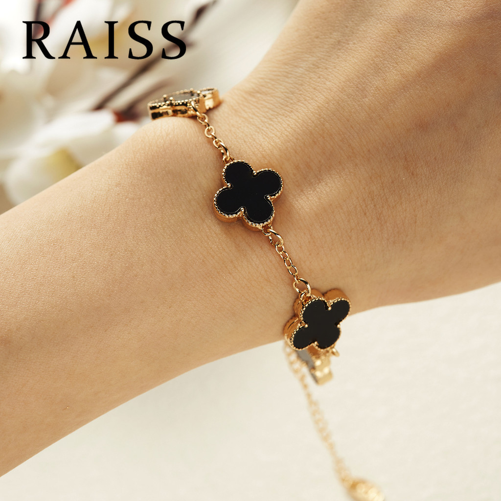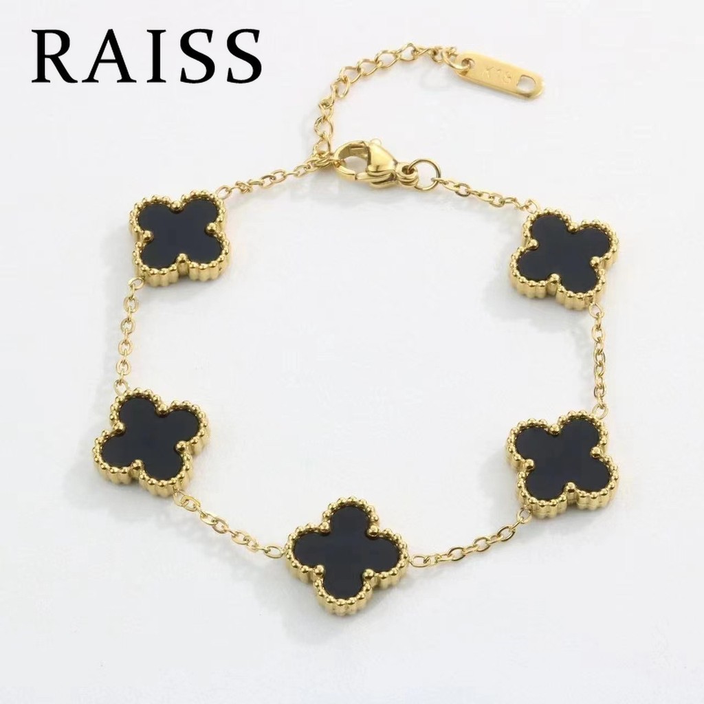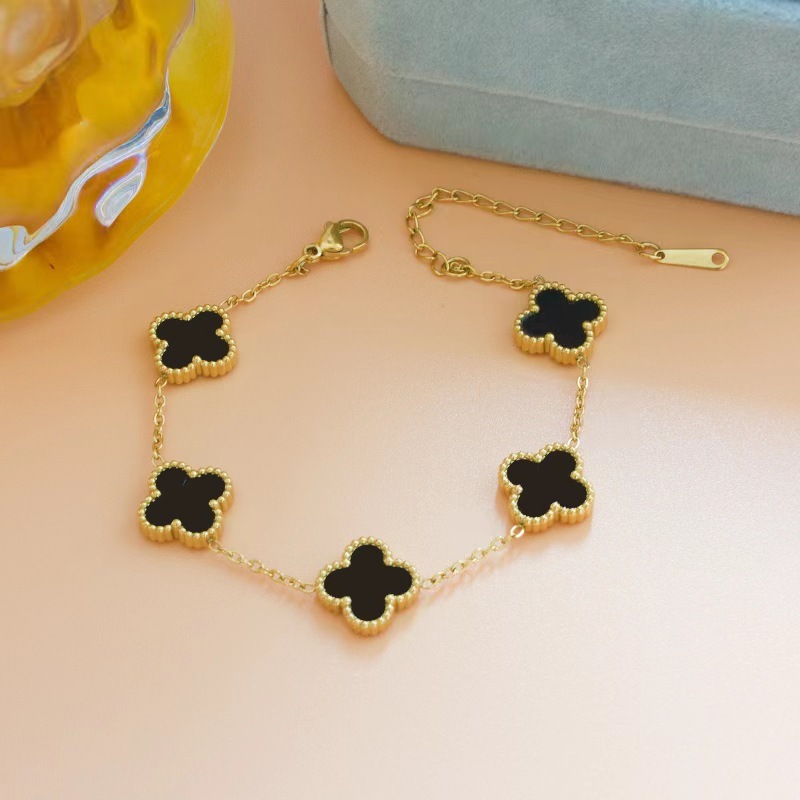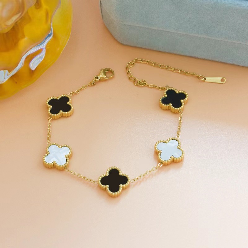 สร้อยข้อมือไทเทเนียม รูปใบโคลเวอร์สี่แฉก หรูหรา สีดํา และสีขาว สไตล์เกาหลี
